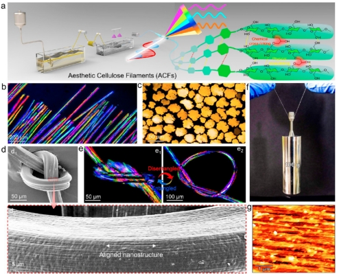 近期,江南大学纺织科学与工程学院龙柱教授团队联合安徽农业大学叶冬冬团队,创造性地开发了美学纤维素纤维(ACF)的制备方法,破解了上述难题。所制备的ACFs在交叉偏振光下呈现斑斓的彩虹色,还表现出极强的韧性,即使单根纤维也可承受100克的重量,并且经过反复缠绕和解缠,纤维表面的有序纳米结构并未被破坏。更有趣的是,作者通过拉曼成像证实,简单的水触发即可调控ACF的内应力,从而实现纤维三维形态的自主定制:湿态下,纤维内应力极低,可以实现纤维的临时造型;而随着纤维逐渐干燥,纤维内应力开始变大,从而实现纤维复杂3D造型的记忆。