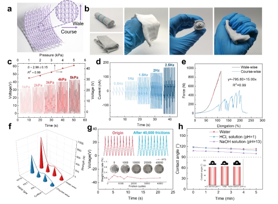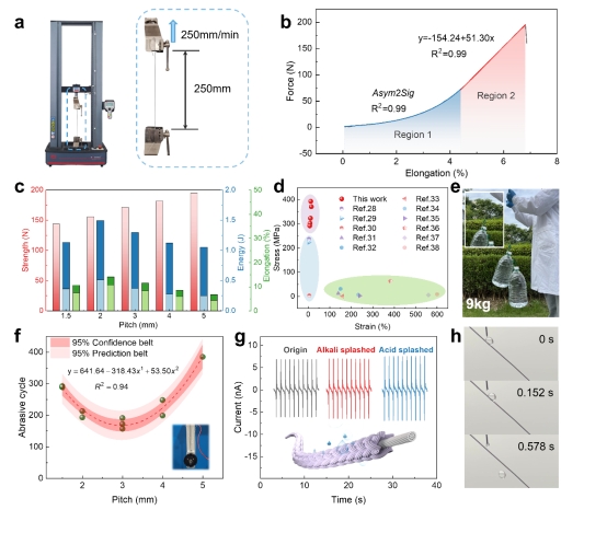 本项工作中,研究人员设计了一种超高强度智能编织纱线(UBSY),并实现了上千米纱线的连续编织。超高分子量聚乙烯纱线外壳赋予了智能纱线优异的强度、耐磨性、耐酸碱液体泼溅性、耐洗涤性和稳定的自供电传感性能。优化后的高致密UBSY直径仅为527 μm,达到了383.12 MPa的超高拉伸应力,单根UBSY可以轻松提起9 kg的水桶,承重性能优异。UBSY与大规模的工业化横机生产适配,得到的全柔性针织智能织物柔软、高强,能准确地感应压力、频率,不仅确保了穿戴者的人身安全和穿着舒适性,还可在复杂、危险的环境中保持稳定的传感能力,为极限运动、军事用途、高风险工业制造活动和高强度医疗缝合等不同领域的复杂特殊环境中的大规模高性能可穿戴应用提供了切实可行的思路。