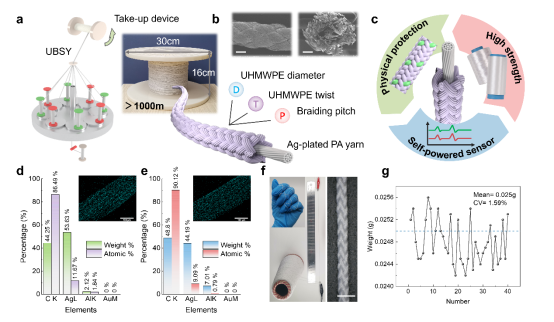 近期,江南大学纺织科学与工程学院/针织技术教育部工程研究中心研究团队实现了从自供电智能纱线到柔性可穿戴针织物的大规模制备。本工作提出的高强度智能编织纱线由高性能的超高分子量聚乙烯纤维外壳和导电芯纱组成,纱线柔软、强度超群(393.12 MPa)、持久耐用、耐酸抗碱,制备的全柔性智能针织护肘可实现人体动作监测,同时为使用者提供了全方位防护,有望应用于户外极限运动、军事活动、高风险工业生产、高强度医疗缝合等各种工况复杂的使用。相关成果以“An Ultrahigh-strength Braided Smart Yarn for Wearable Individual Sensing and Protection”为论文标题在线发表在《Advanced Fiber Materials》期刊(IF=16.1)。江南大学针织中心2021级硕士研究生王开、沈运初为论文共同第一作者;江南大学蒋高明教授团队马丕波教授、陈超余副研究员,无锡市第九人民医院手外科副主任赵刚为论文共同通讯作者。该研究得到了国家自然科学基金(11972172)、中国博士后科学基金资助项目(2022TQ0123)、江苏省自然科学基金(BK20221094)资助。论文全文链接为: