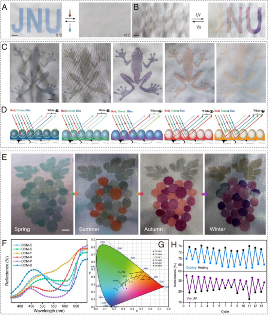 通过丝网印刷方法将TCM,PCN,DCM印刷到织物上,制备出具有动态变色特性的图案。“JNU”标志表现出热致变色行为,用作温度引起的颜色变化的安全特征,字母“JNU”在紫外光照射下表现出动态颜色变化,用作光引发颜色变化的安全特征。丝网印花图案展现了对多种刺激(如温度和紫外光)的动态响应,适合用作动态防伪和信息加密。