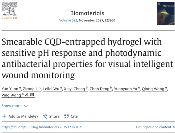 近日,生态染整研究室王平教授与江南大学无锡医学院邓超副教授合作,在生物材料领域国际顶级期刊《Biomaterials》发表题为“Smearable CQD-entrapped hydrogel with sensitive pH response and photodynamic antibacterial properties for visual intelligent wound monitoring”的研究论文,通过纤维素纳米纤维、单宁酸和聚乙烯醇的氢键网络包埋表面羧化的碳量子点(mCQD),制备了一种可涂抹的C-P-T/mCQDs水凝胶,用于伤口感染和愈合状态的实时监测。