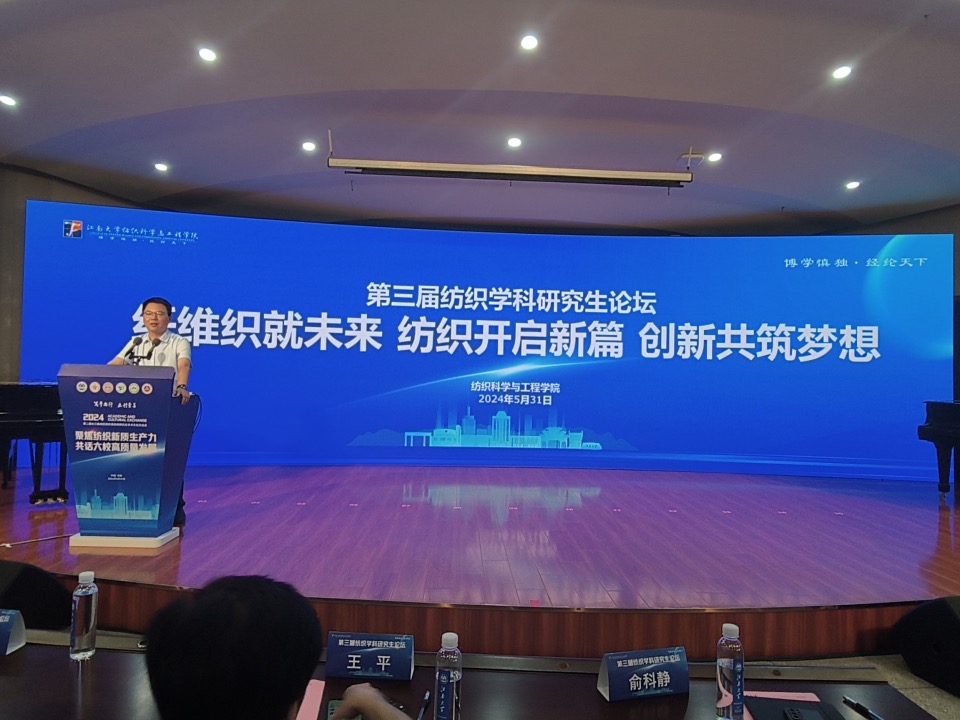 5月31日,纺织科学与工程学院第三届纺织学科研究生论坛在北区活动中心音乐厅举行。纺织科学与工程学院王平教授、俞科静教授受邀作专题学术报告,学院硕、博士研究生参加论坛。论坛由学院副院长马丕波主持。