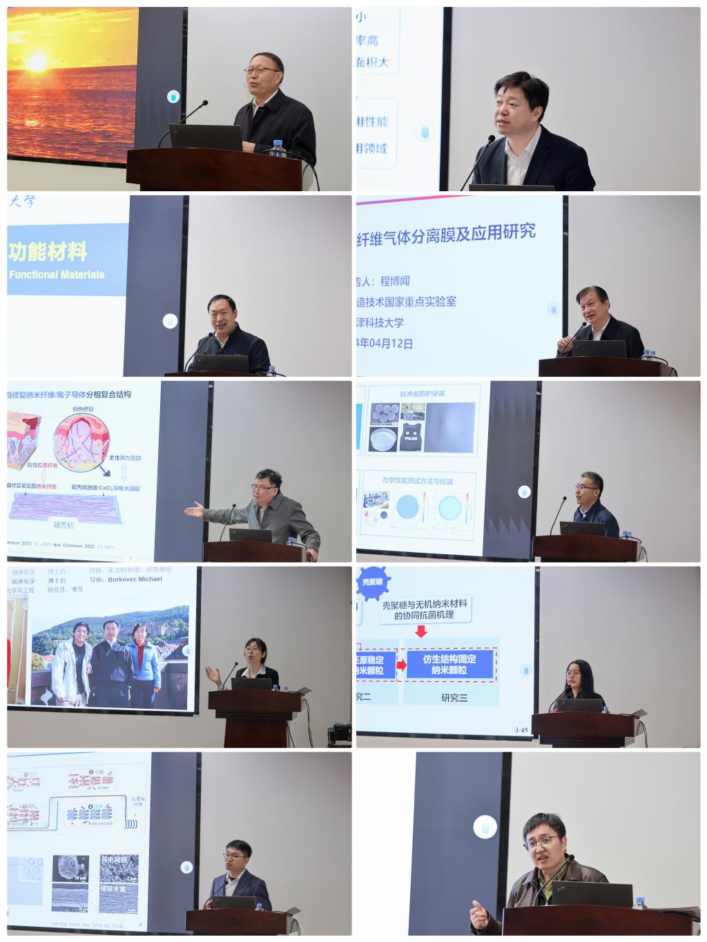 上午论坛包括北京化工大学于中振教授“光热转化复合材料及热能存储利用”、东华大学丁彬教授“防隔热用超细纤维材料”、华东理工大学曲大辉教授“动态化学与功能组装材料”、天津科技大学程博闻教授“高性能聚酰亚胺中空纤维气体分离膜及其应用研究”、东华大学武培怡教授“液滴塑造纤维”、中国科学技术大学宣守虎教授“剪切增稠复合材料与智能防护穿戴”等学术报告,由江南大学刘天西教授和中科院苏州纳米所张学同教授先后主持。下午论坛包括四川大学林炜教授“生态皮革工业互联网平台建设进展”、华南理工大学王小英教授“壳聚糖复合抗菌材料的绿色构建与应用”、南京工业大学暴宁钟教授“二维材料基纤维的有序构筑及储能应用研究”、中科院苏州纳米所张学同教授“气凝胶纤维设计制备与应用”、东华大学侯成义研究员“传感与交互纤维电子器件”等学术报告,由严锋和于中振先后主持。