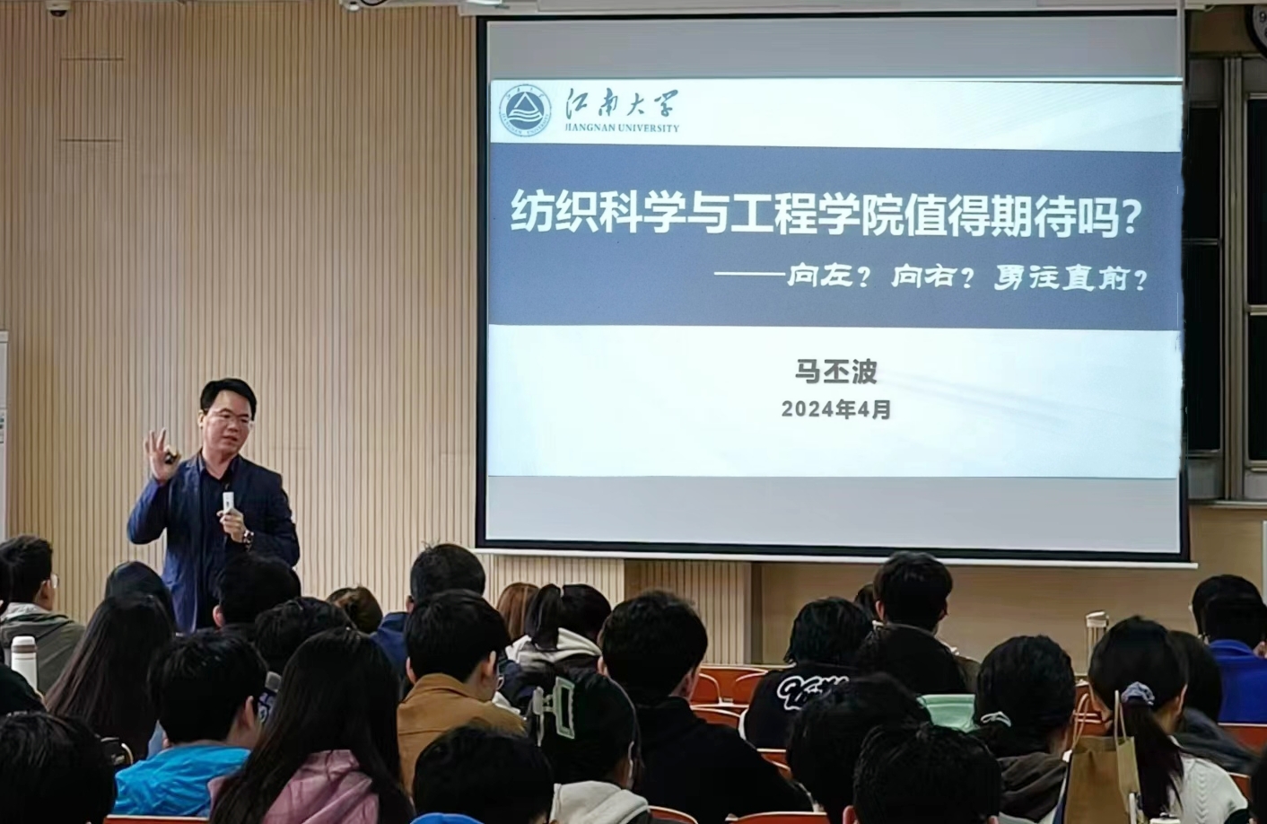 马丕波从“纺织科学与工程学院的前景如何?”切入,为同学们详细分析了学院近年来升学及就业情况。他勉励同学们“早立志,要明确自己的目标,而非盲目地随大流;早准备,提前做好能力准备,防止‘书到用时方恨少’;早行动,提前做好职业生涯规划,并踏实做好践行。”