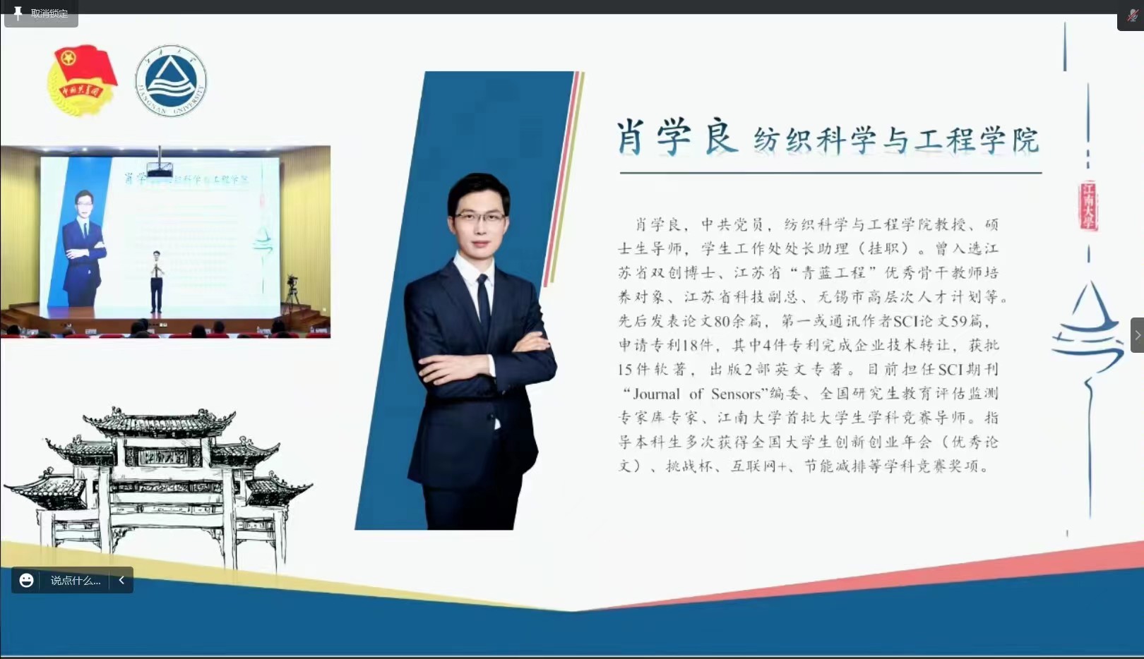 纺织育人正当时,师生奋进皆可期。决赛现场,肖学良老师以自身求学经历出发,通过学生视角,从教学成果、科创竞赛、成长指导等多个方面,讲述了自己在七年教师生涯里与学生间的真挚师生情谊,充分展示了纺织学院教师“严管厚爱”的育人理念、认真务实的工作态度以及扎实的专业素养。作为一名扑在教学一线的年轻教师,肖学良老师始终牢记“江南纺织人”的使命与担当,着力提高学生的知识积累和创新创业能力,鼓励学生走进实验室,积极开展课题研究,为实现纺织服务民生福祉贡献青年力量。汇报展示中,纺织学院学生代表还通过现场“三句半”、线上送祝福等丰富形式为肖老师加油助力。