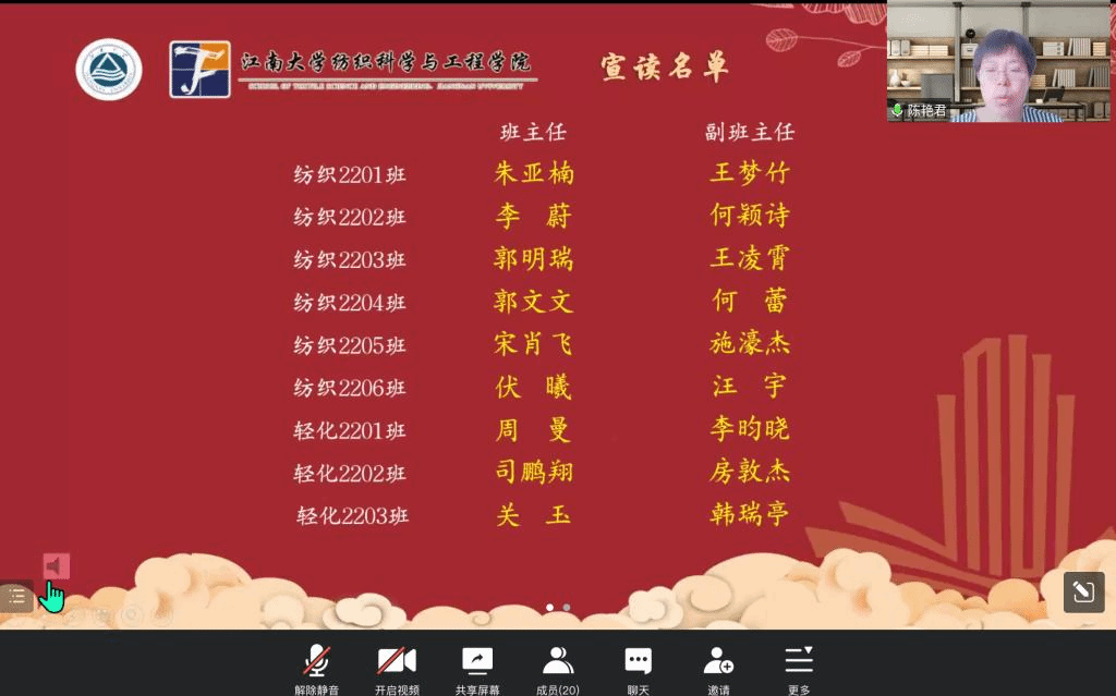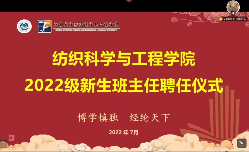 会上,陈艳君宣读了《江南大学纺织科学与工程学院2022级新生班主任聘任名单》,张菁为朱亚楠等9位班主任和王梦竹等9位副班主任线上一键颁发聘书。