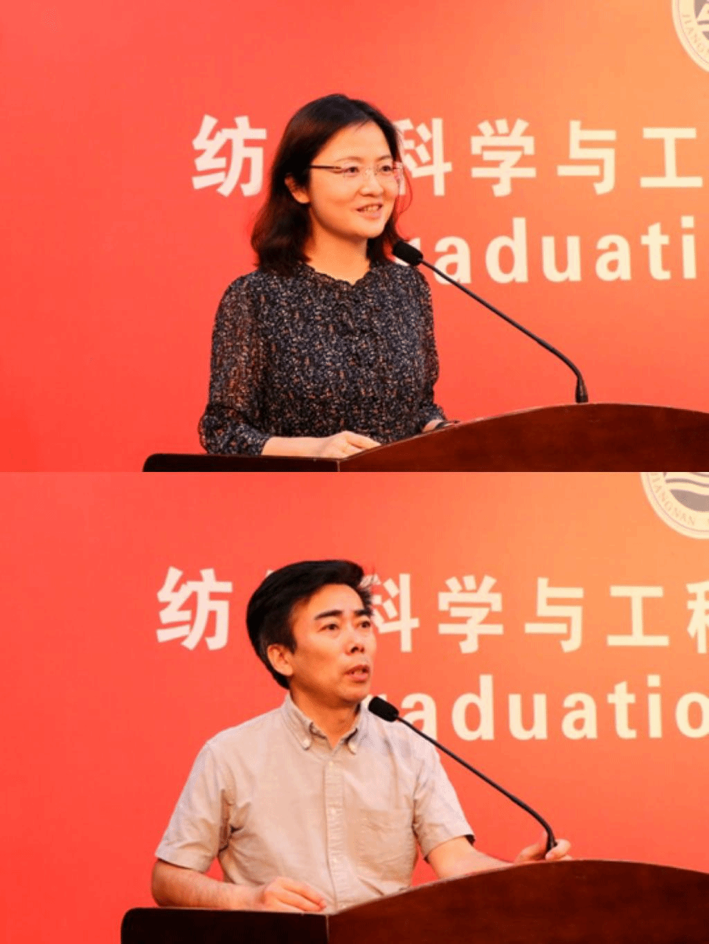 纺织系系主任傅佳佳教授、轻化系系主任王平教授作为教师代表发言,向毕业生表达祝贺和美好祝愿,希望毕业生在未来的人生路上,用主动、积极、向上的心态迎接生活中的挫折与困境,用才情、智慧、胆识和毅力,开辟属于自己的天地。