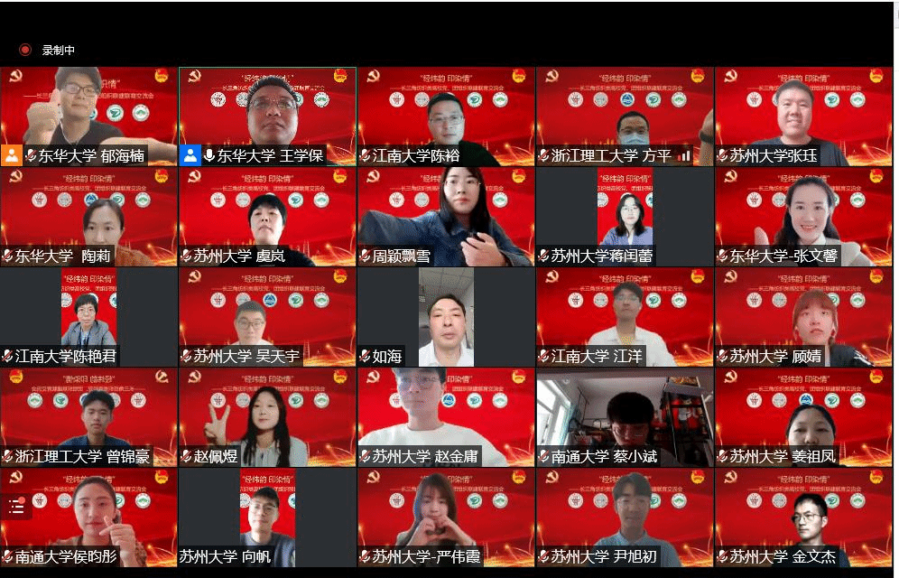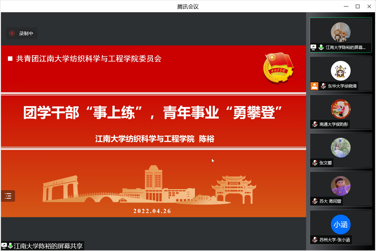 为以崭新的面貌、奋进的姿态迎接党的二十大胜利召开,同时进一步加强新形势下党团组织建设,强化党团组织之间交流合作,实现“党建强、发展强”的目标,构建“资源共享、优势互补、同心协力、进取共赢”的党团建设工作新格局。4月26日下午,纺织科学与工程学院90名师生,参加由东华大学化学化工与生物工程学院发起主办的“经纬韵 印染情”——长三角纺织印染类高校党、团组织联建联育工作交流会,交流会设主会场和面向团委书记、党支部书记、团支部书记的三个分会场,活动通过腾讯会议开展。来自东华大学、苏州大学、江南大学、浙江理工大学、南通大学五校共建学院的党委副书记、学工办主任、团委书记及15个党、团支部500余名师生相聚“云端”,就纺织印染类高校党团组织建设建言献策,通过交流分享,集思广益,共同助力联建联育成效落到实处。交流会由东华大学化学化工与生物工程学院学工办主任王学保老师主持。