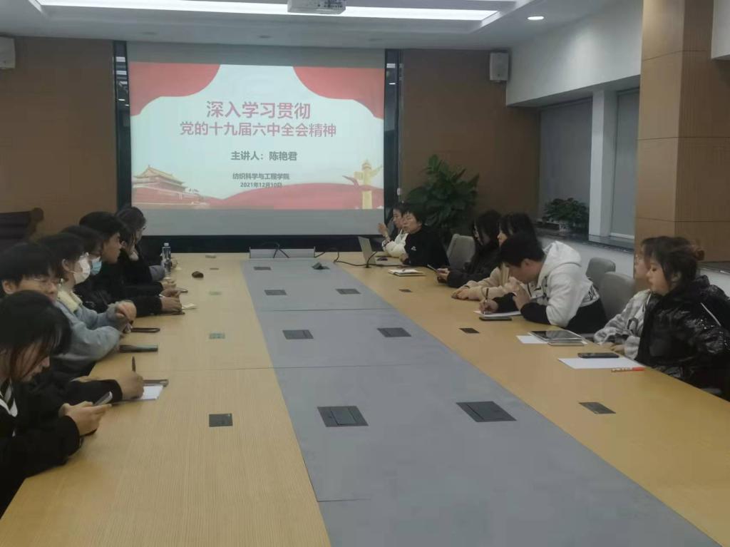 为深入开展党的十九届六中全会精神学习活动,及时给基层党支部传达会议精神。2021年12月10日,纺织科学与工程学院党委副书记、副院长陈艳君老师在学院A306会议室为本科生党支部党员上了一堂生动活泼的党课。此次党课主要面向纺织本科生党支部和轻化本科生党支部成员及第42期党的发展对象。