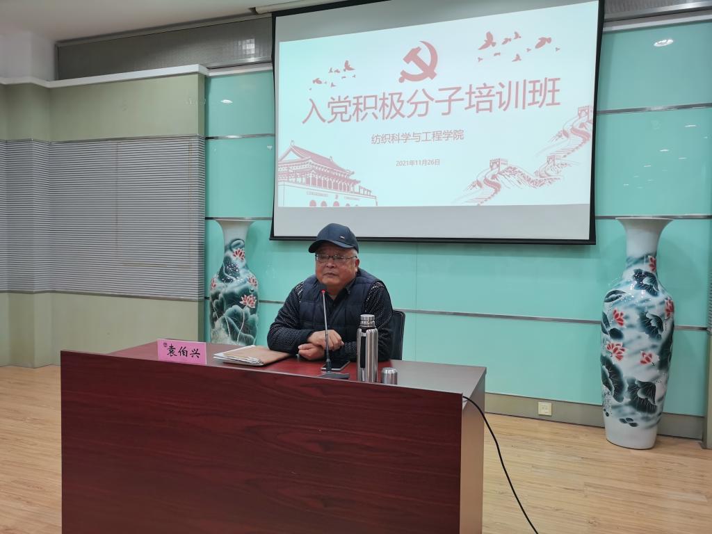 为帮助入党积极分子端正入党动机,提高思想觉悟,用教育引导入党积极分子加深对党的认识和理解,2021年11月26日,纺织科学与工程学院举办入党积极分子培训班。本次培训班特别邀请纺织科学与工程学院关工委常务副主任、特邀党建组织员袁伯兴老师为同学们讲课。