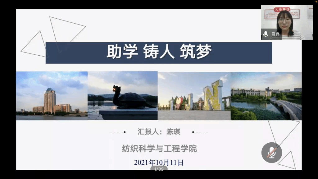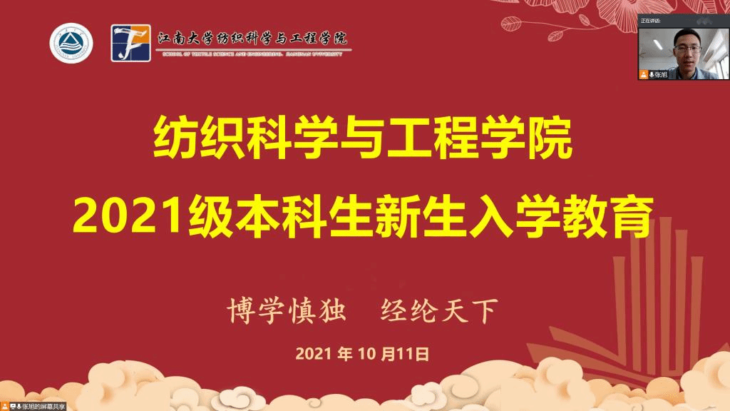 10月11日晚,纺织科学与工程学院2021级本科新生入学教育讲座在线上顺利举行。本次讲座主要分为“学霸讲堂”、“资助政策解读”、“学生组织介绍”三个环节,2021级全体本科新生聆听了讲座。讲座由2021级本科生辅导员张旭主持。