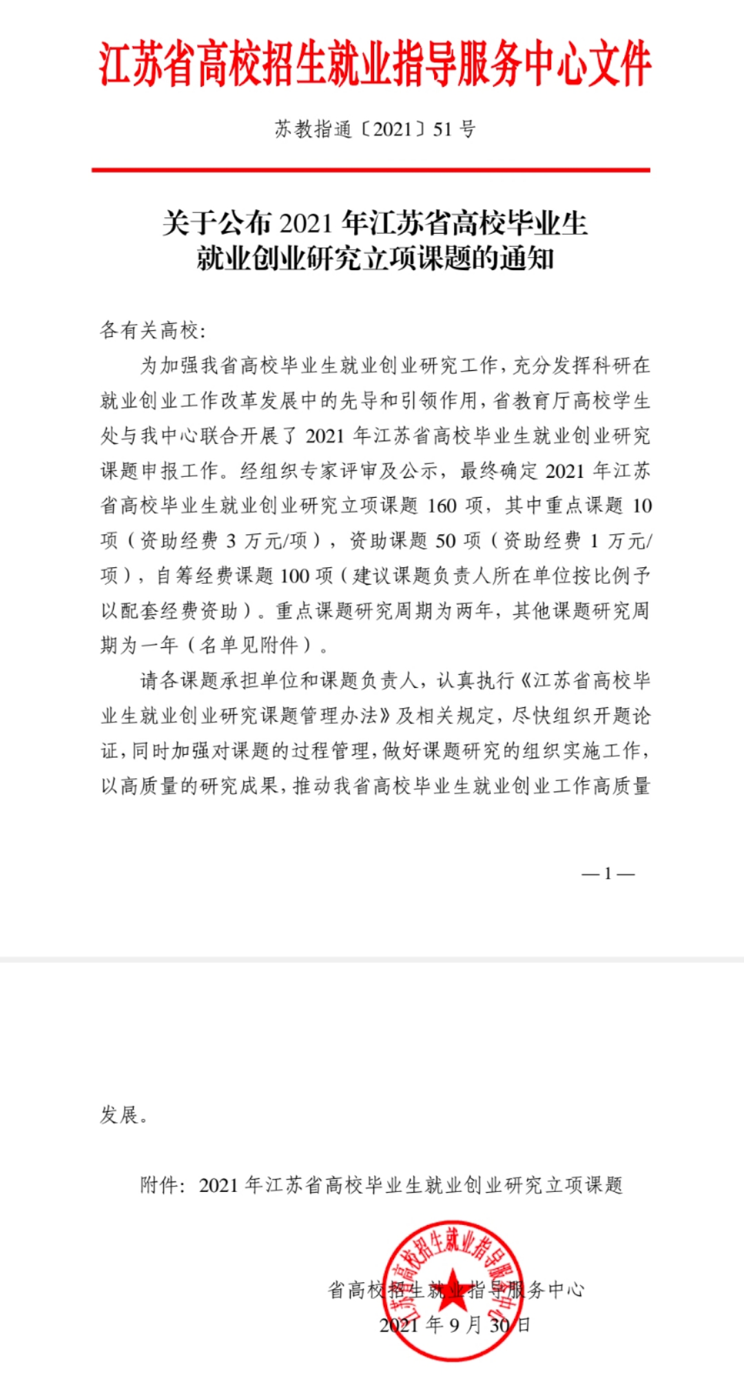近日,江苏省高校招生就业指导服务中心发布了《关于公布2021年江苏省高校毕业生就业创业研究立项课题的通知》,经专家评审及公示,学院辅导员陈裕老师主持申报的课题《“新工科”视域下<职业规划与就业指导>课程思政研究》获批立项。