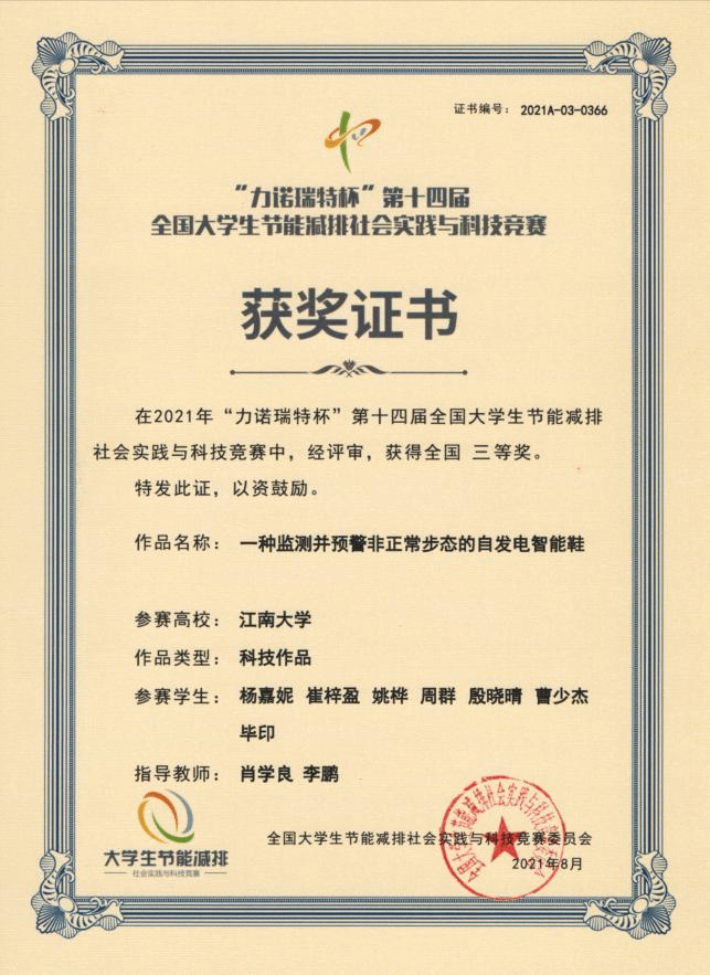 近日,“力诺瑞特杯”第十四届全国大学生节能减排社会实践与科技竞赛在山东大学落下帷幕。经过大赛组委会的评审,我院肖学良老师指导、纺织1802班杨嘉妮同学负责的科创作品《一种监测并预警非正常步态的自发电智能鞋》(参赛学生:杨嘉妮,崔梓盈,姚桦,周群,殷晓晴,曹少杰)荣获全国三等奖。