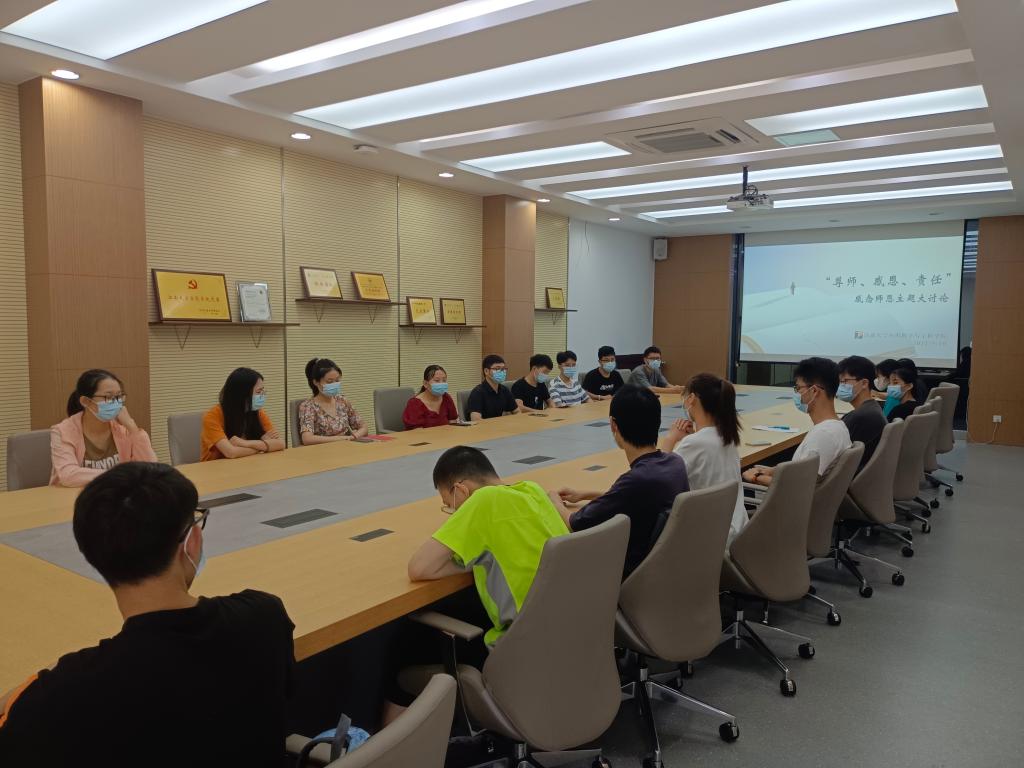 讨论会上,同学们发言热烈,表达了对老师们孜孜不倦教书育人的感谢之情,也讲述了一些与老师之间有趣有爱的温馨小故事。一位同学说,来到江大之后第一个遇到的是班主任老师,班主任老师幽默、有责任心,平时很关心班上同学的学习与生活,会给同学们制定学习目标,给予大家很多的期望与鼓励。一位大四同学表示:“老师就是我们前进路上的照明灯,我们要懂得感恩老师、尊重老师,我们的学习和成长都离不开老师的培养,祝所有老师教师节快乐”。除了辛勤付出的专业课老师,好几位同学都提到了亦师亦友的辅导员老师。今年暑假期间,学院辅导员老师们无微不至地关注着留校同学们的生活情况,不仅关心同学们的学习,还尽心尽力关切同学们的心理健康。研究生同学代表提到,研究生导师不仅仅是老师,更像是朋友,在科研上给予指导,在生活上给予关心陪伴。
