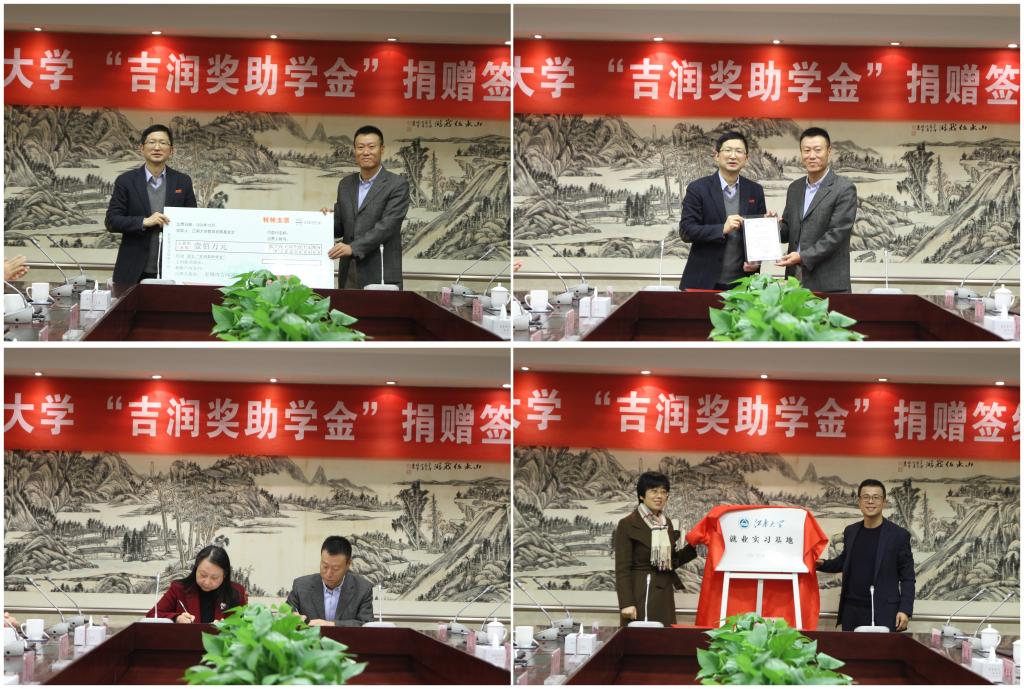 接着,在双方领导嘉宾的见证下,张菁书记与范恒明董事长签署了捐赠协议,张菁燕部长与范毅峰总经理为就业实习基地揭牌。张凌浩副校长代表学校和学院接受了捐赠,并向吉润公司颁发捐赠赠书。