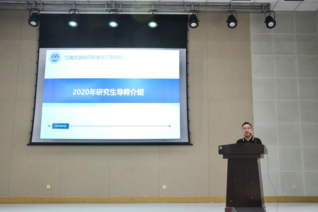 院长付少海教授向同学们介绍了江南大学纺织科学与工程学院自建立以来的发展变革,并着重介绍了各个学科方向、各团队的科研成果以及获得的各项荣誉。不仅如此,付院长还就本学院学科情况、国际交流现状、人才培养质量、奖助学金以及纺织教育发展基金会等情况进行了详尽的介绍。同时付院长也告诫2020级研究生新生,研究生应以科研学业为正,在与导师保持良好的沟通,保持健康体魄的同时,也要保持阳光向上的心理状态。