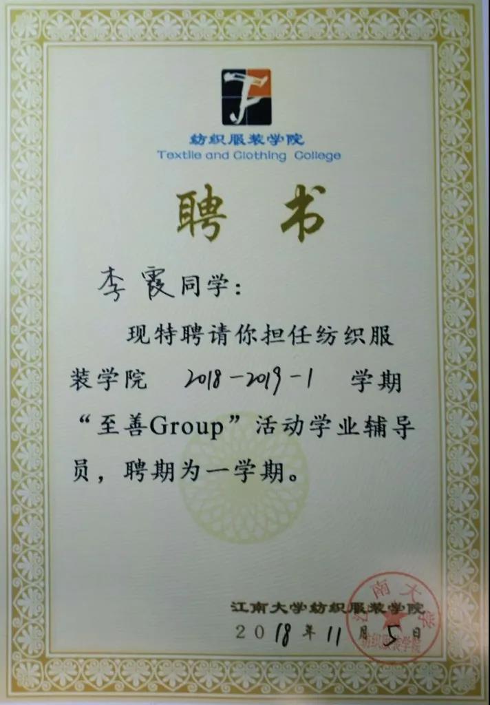 我很荣幸在大一时入选了我们学校的荣誉学院——至善学院。至善学院是江南大学选拔拔尖人才的基地,从各学院选取成绩排名前3%的同学组成虚拟学院。“在其位司其职”,在以后的日子里我不敢有所懈怠,努力丰满自己的羽翼。大一学年获得了国家励志奖学金,学业二等奖学金。