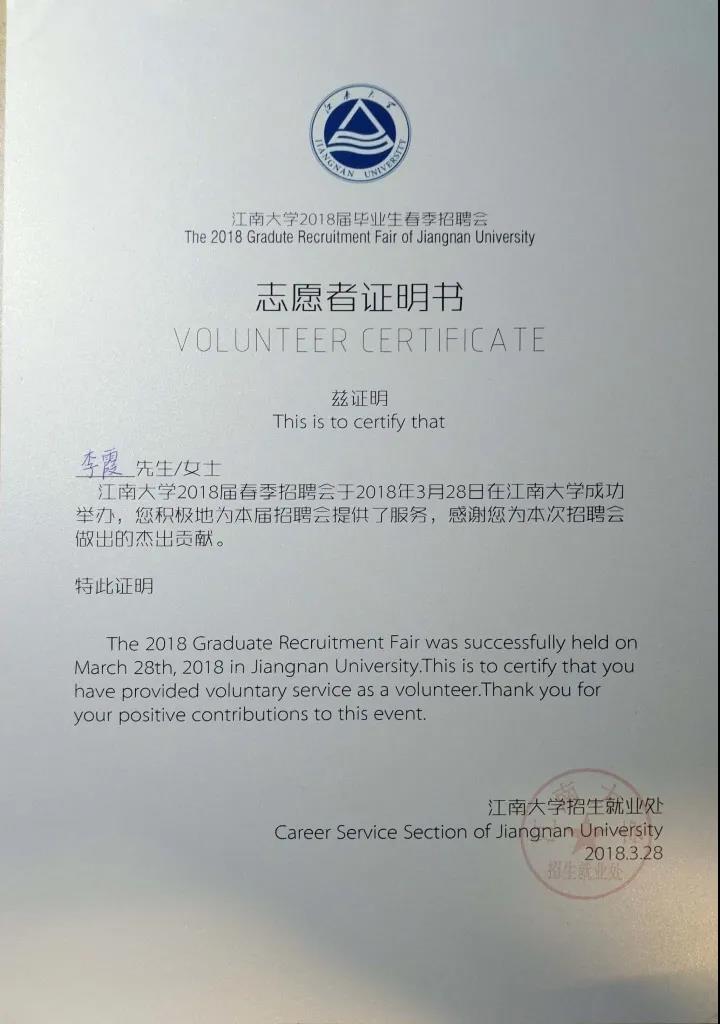 喜欢参加课外的实践活动,曾在校运会、江南大学春季大型招聘会、无锡马拉松等活动中担任志愿者,为学校师生服务,为他人争取“岁月静好”;也会积极响应号召,参加学校或学院组织的活动,如汉文化知识竞赛、笔录芳华、至善group、方宇杯等,去不同的领域遇见不一样的自己。利用空闲时间参与勤工助学,刚开始的时候做事不够细致,导致事半功倍,然“天下大事,必作于细”,这段经历让我对自己有了更清醒地认知,一个人的成长也离不开精雕细琢。