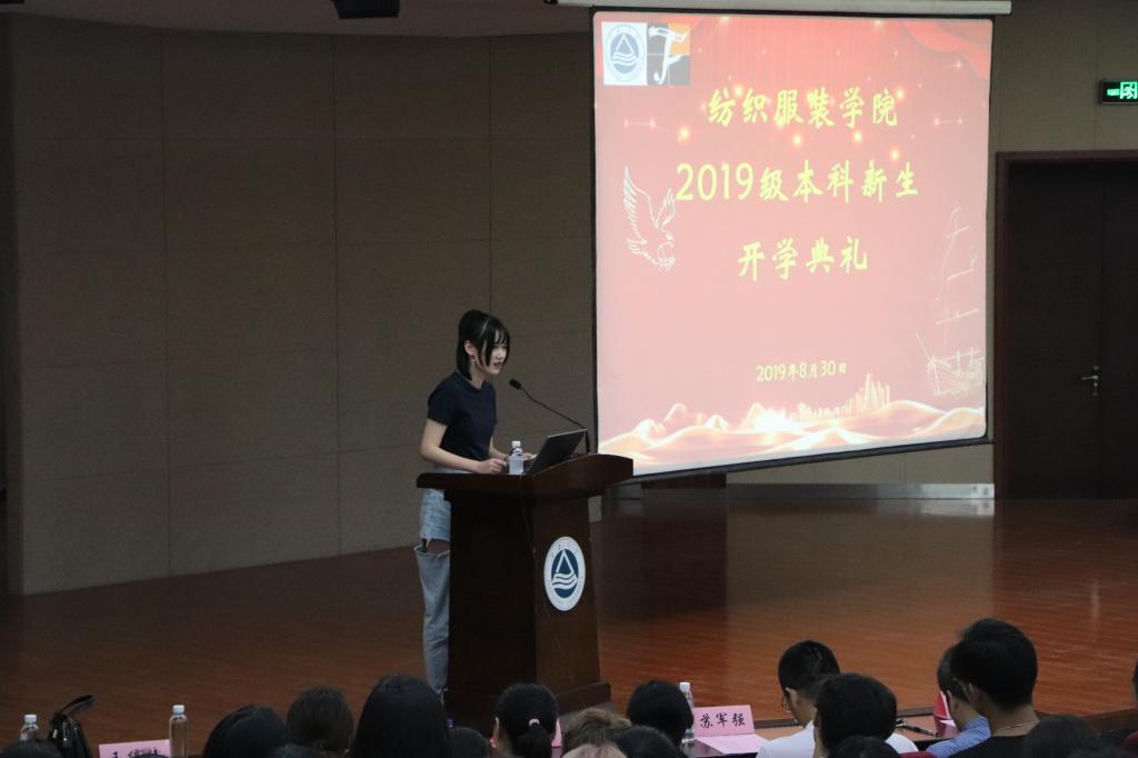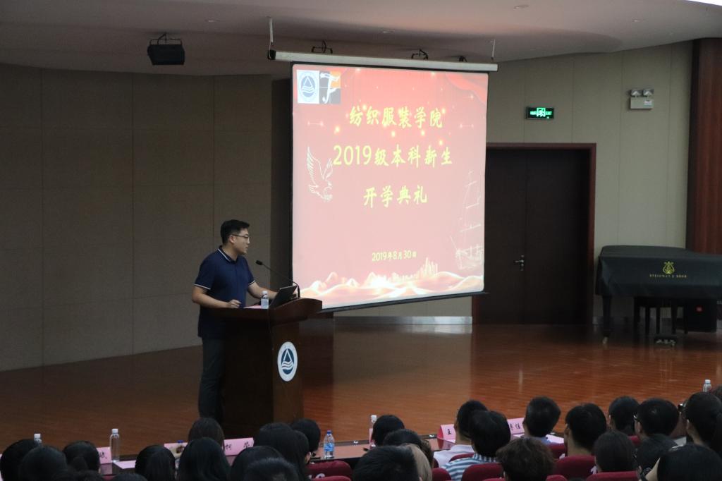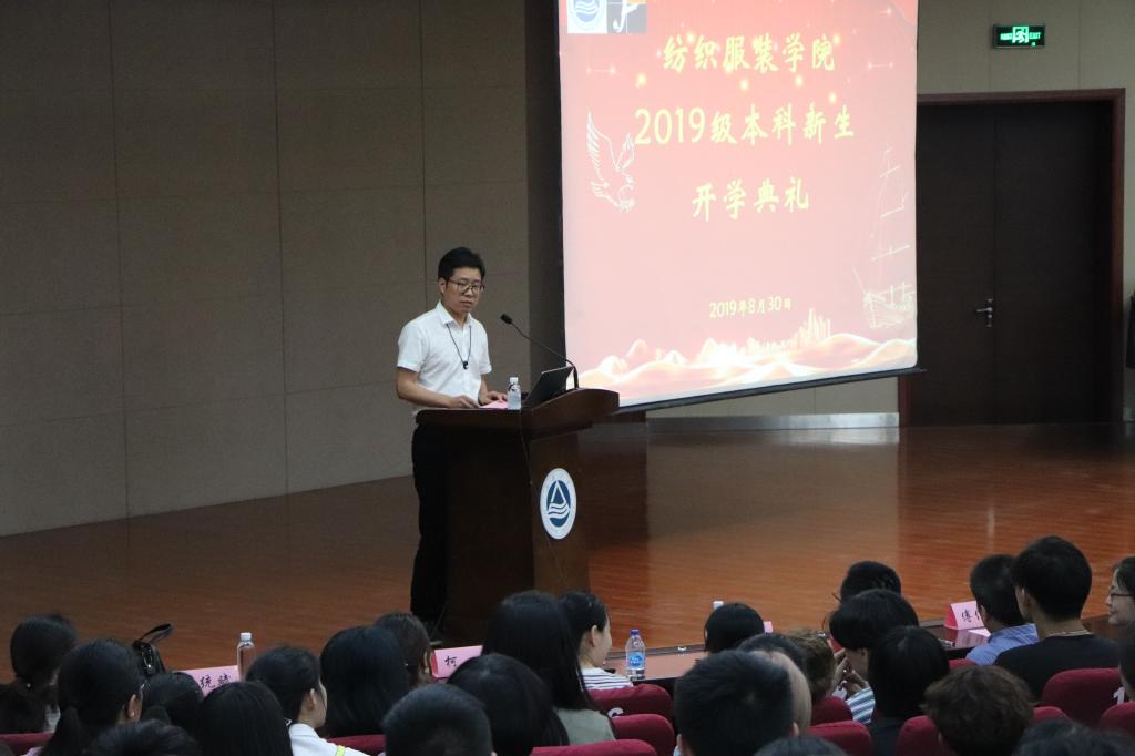 83014时,纺织服装学院2019级本科新生开学典礼在北区大学生活动中心成功举办,院党委书记张菁、院长付少海、院党委副书记周云龙、副院长黄锋林、潘春宇以及各系主任、新生辅导员、全体新生班主任出席,典礼由院学工班主任王统斌主持。