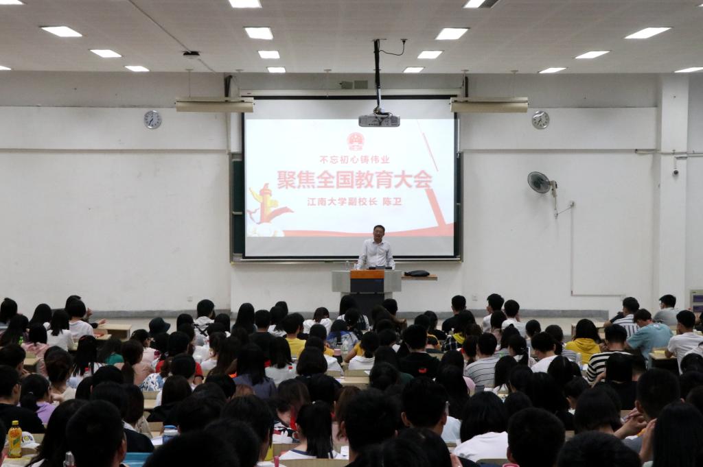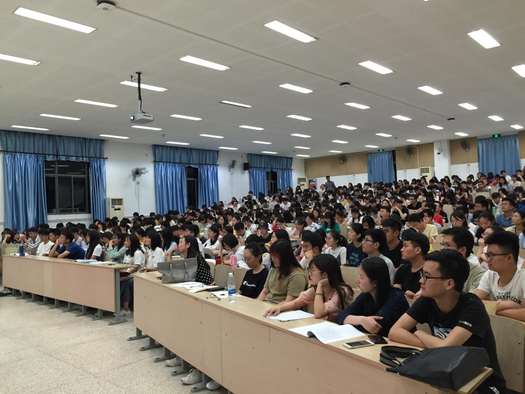 2019年5月21日晚,江南大学副校长陈卫教授走进思想政治理论课课堂,为纺织服装学院2015级、2016级本科生讲授形势与政策课,500多名学生参加学习,学院党委书记张菁,党委副书记周云龙,辅导员王统斌、陈裕、马倩如到现场听课。