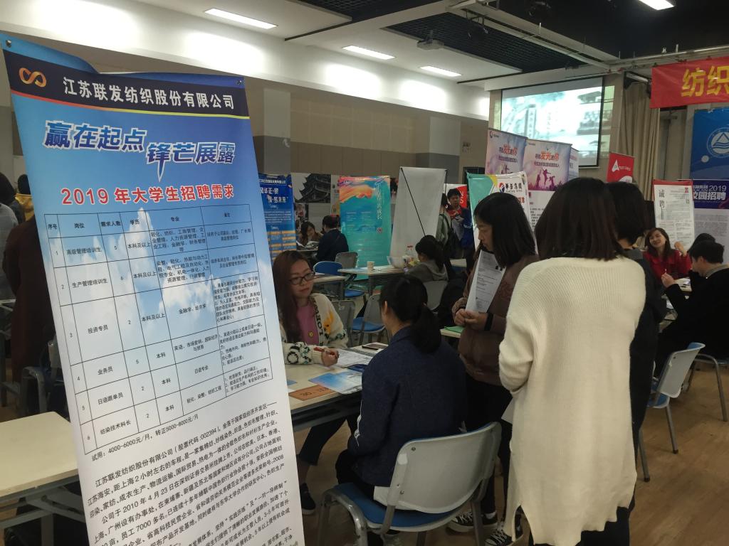 我院2019届毕业生共517人,其中本科毕业生363人,研究生毕业生154人。本次招聘会共有来自省内外的65家纺织、轻化、服装行业的单位参会,其中包括江苏省纺织研究所股份有限公司、通标标准技术服务有限公司、江苏红豆国际发展有限公司、浙江恒逸集团有限公司等国内知名企业,共为毕业生提供就业岗位1254个。本科生平均起薪:6000/月,硕士研究生平均起薪:8000/月,博士研究生平均起薪:12000/月。
