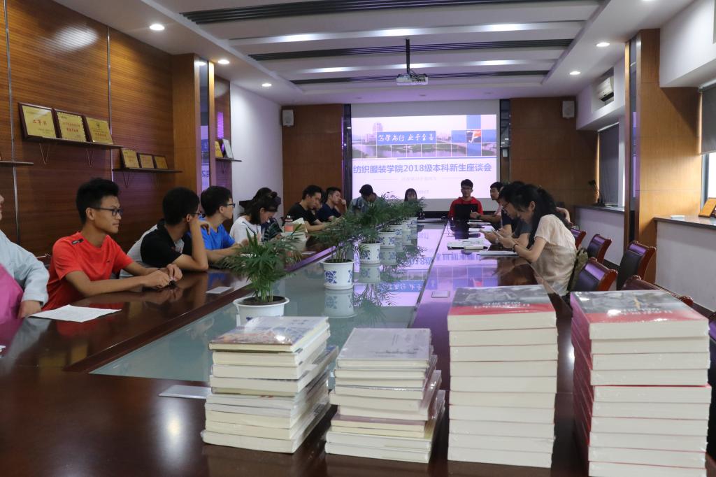 为了更好地落实学院新生转型教育工作,了解本科新生学习生活适应情况,在全国第34个教师节来临之际,我院在A306会议室召开了2018级本科新生代表师生座谈会。院党委书记张菁,院长助理、纺织系教师代表傅佳佳,轻化系教师代表许长海,“我最喜爱的老师”获得者、服装系教师代表薛哲彬来到同学们中间,与17名学生代表进行了面对面交流。座谈会由院党委副书记、副院长周云龙主持。