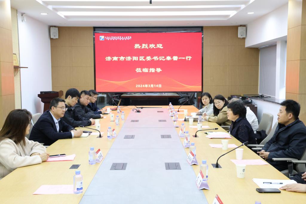 3月14日,济南市济阳区委书记秦蕾率队,济阳区副区长、开发区管委会、区投资促进局以及青岛少海发展集团、青岛海益汇鑫投资有限公司、金达伟业(青岛)有限公司等企业单位负责人一行,来纺织科学与工程学院调研交流。学院院长付少海主持交流座谈会。