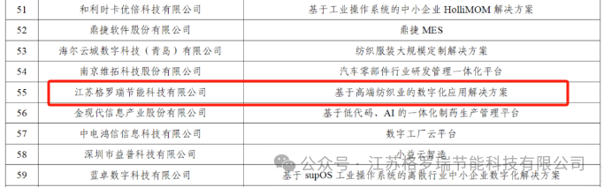 近日,我院校友企业江苏格罗瑞节能科技有限公司的“基于高端纺织业的数字化应用解决方案”荣获国家级荣誉,被工业和信息化部中小企业局选入2023年中小企业数字化转型典型产品和解决方案之列。