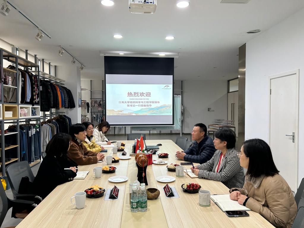 范恒明对张菁燕一行来访表示欢迎,并结合自身创业的经历介绍了公司基本情况、发展目标及未来展望。他表示,作为一家长期深耕进出口贸易的专业纺织服装生产供应商,近年来,公司业务稳健增长,特别是在跟学院建立合作伙伴关系以来,公司在做好“家门口”大学的公益活动中也在成长进步,还从学生科创作品项目中看到了不少创意设计。他强调,公司将一如既往支持并做好江南大学“吉润奖助学金”这个公益项目,为学院人才培养工作发挥好行业和企业作用。