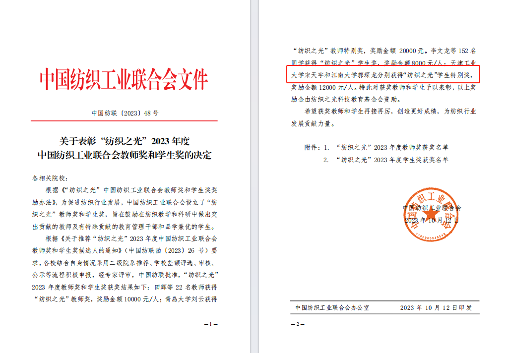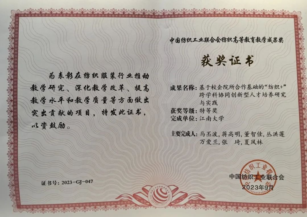 “纺织之光”中国纺织工业联合会奖项由中国纺织工业联合会设立,旨在促进纺织行业发展,鼓励在纺织教育和科研中做出突出贡献的教师及有特殊贡献的教育管理干部和品学兼优的学生。本次评选表彰中,江南大学纺织科学与工程学院马丕波教授荣获“纺织之光”教师奖(全国仅22位),陈亚君、高鹏翔、郭琛龙、金芳羽、刘帅4位学生荣获“纺织之光”学生奖,郭琛龙荣获学生特别奖(全国仅2位)。由马丕波、蒋高明等教授共同完成的“基于校企院所合作基础的‘纺织+’跨学科协同创新型人才培养研究与实践”成果荣获纺织高等教育教学成果奖特等奖,由王清清、黄锋林等教授共同完成的“PBL研究型教学理念在‘纺织材料学’线上线下贯穿融合式教学中的课程构建与实践”荣获教学成果奖一等奖。