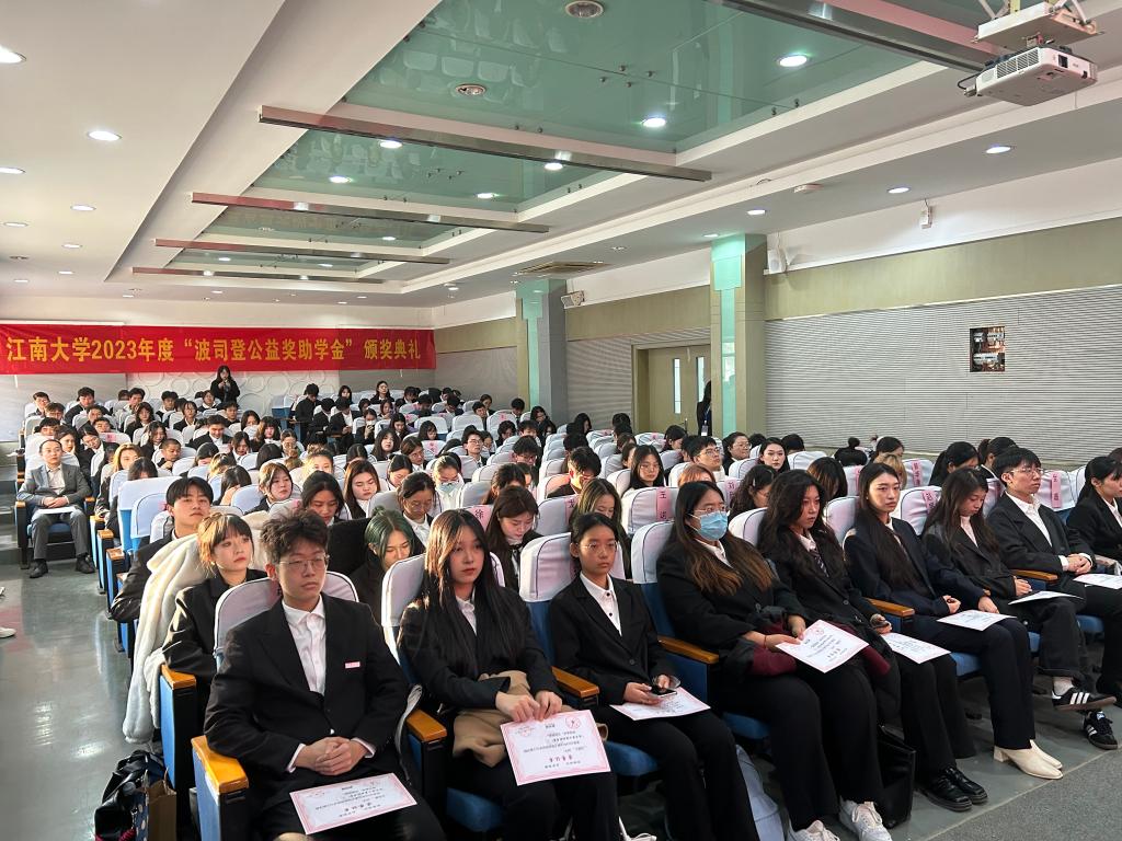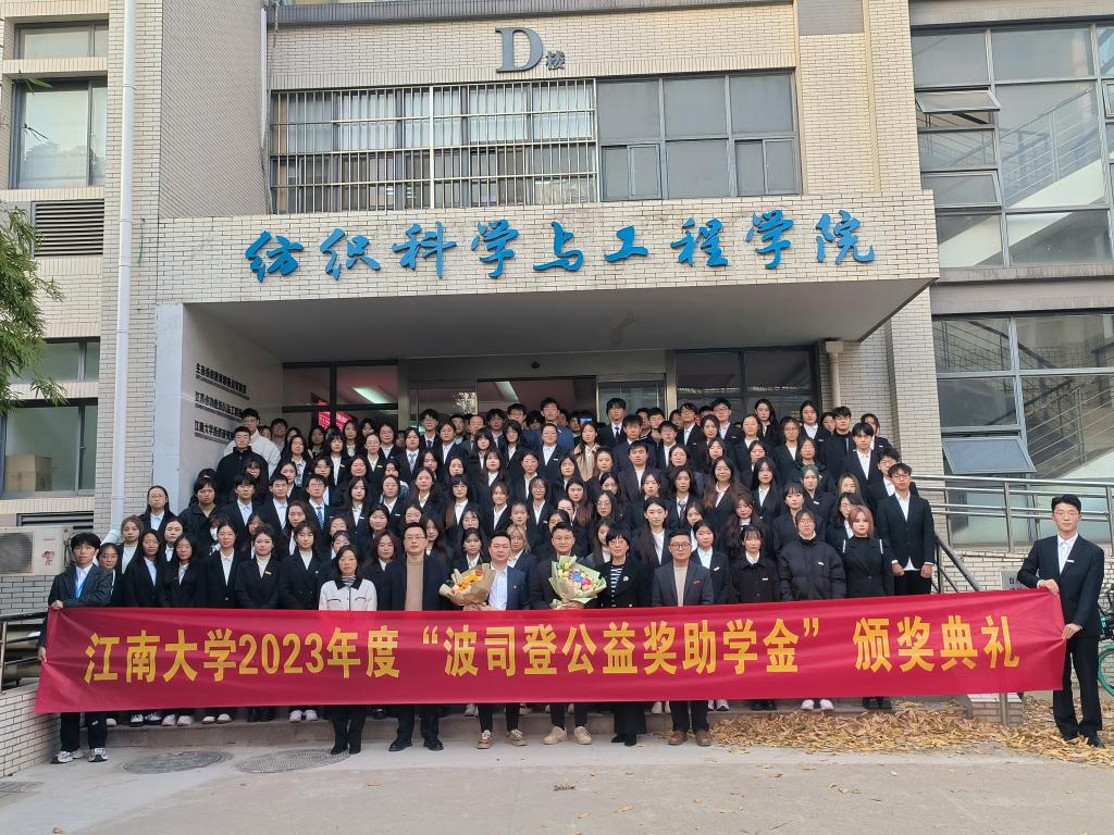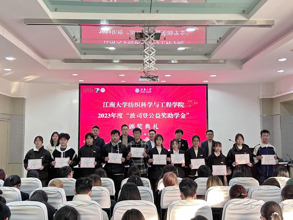 12月6日,2023年“波司登公益奖助学金”颁奖典礼在纺织科学与工程学院A103举行。波司登集团招聘总监陈祖鹏,高级招聘专家宋振,设计学院党委书记王维青,纺织科学与工程学院党委书记张菁燕、副书记兼副院长杨莉勤出席颁奖典礼。典礼由纺织科学与工程学院学工办主任兼分团委书记陈裕主持。