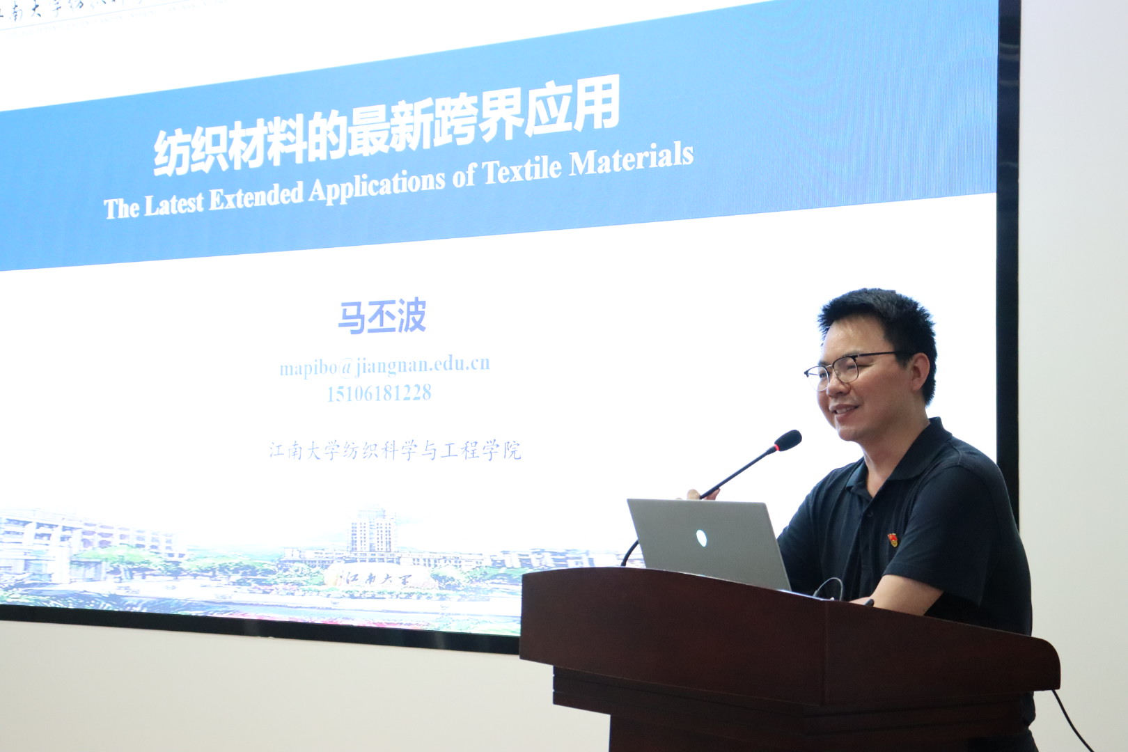 接着,纺织科学与工程学院副院长马丕波进行了专业学术讲座。马丕波教授以“纺织材料的最新跨界应用”为主题,结合个人求学经历,生动诙谐地向同学们介绍了纺织工程和轻化工程专业、中国纺织工业的现状以及学院在研的各类纺织结构织物。他指出,纺织行业已不是传统的纺纱织布,而是在与多学科交叉融合的过程中,朝着“面向世界科技前沿、面向经济主战场、面向国家重大需求、面向人民生命健康”的方向发展。除此之外,他还向学生们介绍了几个学生培养案例,激励着同学们向更高更远的方向奋进,纺织未来有无限可能。