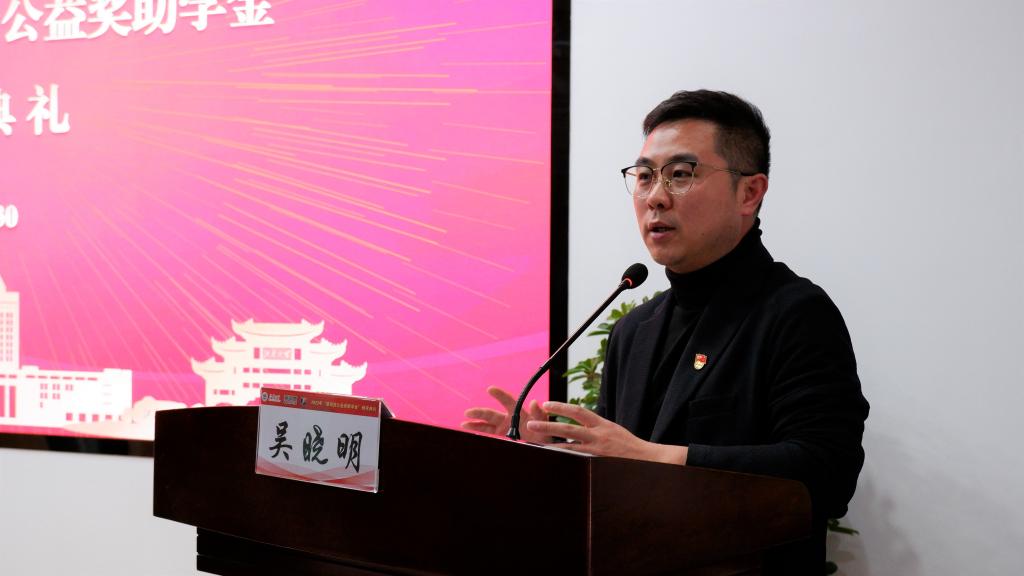 波司登集团人力资源中心总监吴晓明先生作为设奖单位代表发言。吴晓明先生首先代表集团对所有获奖同学表示衷心的祝贺。他分享了集团创立至今一直践行的文化使命:波司登温暖全世界。其所包含的内核有三点:一是波司登要温暖顾客,用产品温暖每一个人;二是要温暖员工,让员工和企业一起成长;三是要温暖社会,始终致力于公益事业。吴晓明先生提出了波司登集团“世界羽绒服,中国波司登”的伟大愿景,希望波司登能作为服装行业优秀的民族品牌站起来,依靠中国市场,走向全球。最后,吴晓明先生表达了对江南大学一直以来人才支持与合作的感谢,并期待有更多江大学子加入波司登,为中国纺织行业注入更大的力量。随后,轻化1903班孙熔声、服艺1903班缑钰昇、纺织2003班王凌霄3位同学向设奖单位献花,表达了对波司登集团捐资助学善举的感谢。