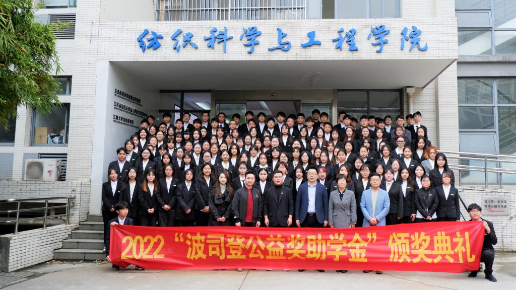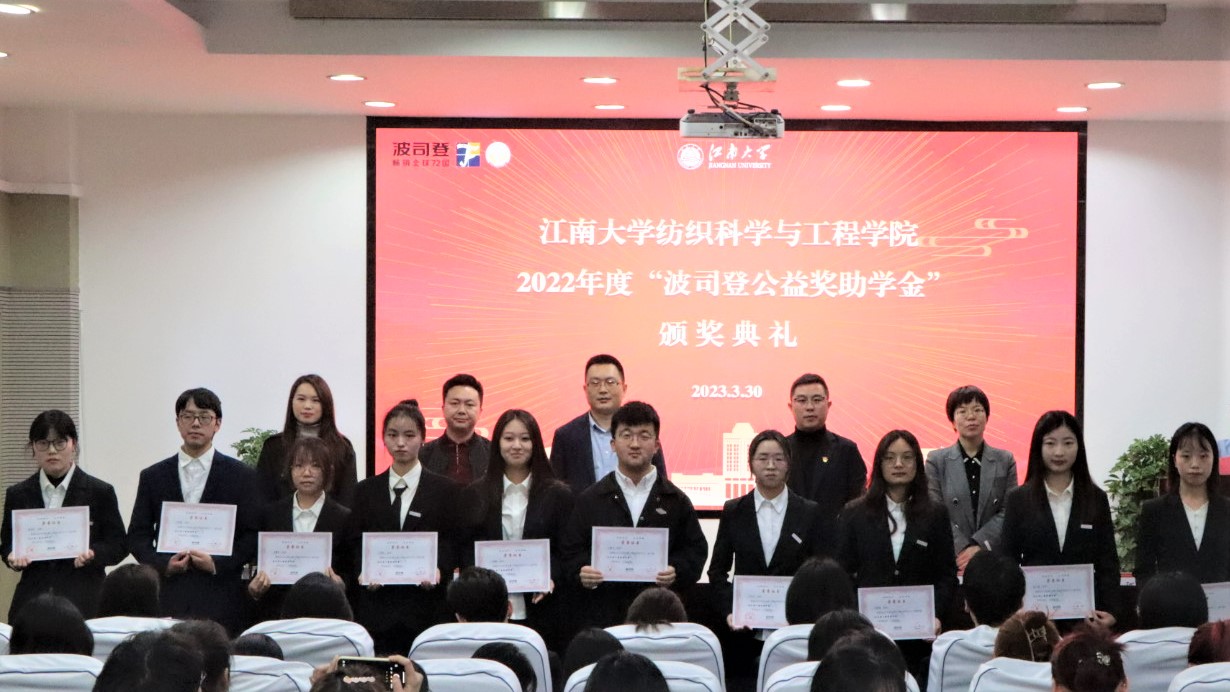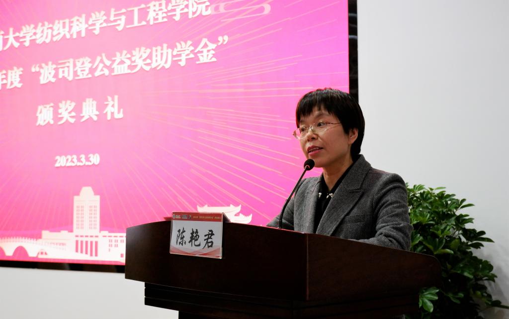 3月30日,纺织科学与工程学院2022年度“波司登公益奖助学金”颁奖典礼在学院A103举行。波司登集团人力资源中心总监吴晓明,招聘总监陈祖鹏,总监助理张梦琴,设计学院党委书记王维青,纺织科学与工程学院党委副书记陈艳君出席颁奖典礼。典礼由纺织科学与工程学院分团委书记陈裕主持。