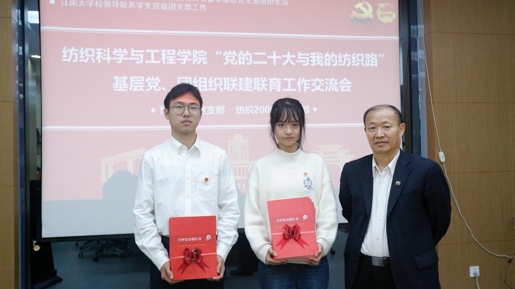 顾正彪副校长以《深入贯彻党的二十大精神——以中国式现代化全面推进中华民族伟大复兴》为主题对与会的青年学生开展宣讲。他紧扣党的二十大报告原文,首先总结了党的二十大总体情况及主要成果,对党的二十大精神进行系统解读和深入阐释,他着重强调要深入对照党的二十大报告所确定的重大战略部署,特别是关于教育、科技、人才的总体要求,结合本校实际找准贯彻落实的结合点、切入点和着力点,切实把各项工作谋划好、组织好、开展好,努力把各方面优秀人才集聚到党和人民事业和学校改革发展中来。此外,顾校长还介绍了我校近年来的改革发展情况,立足七个不同方面,展示学校在学科建设和人才培养等方面取得的优秀成果,鼓励同学们既要怀抱梦想,又要脚踏实地,为学校“奋进计划”的实施和世界知名、中国一流、江南风格的研究型大学建设而不懈奋斗。最后,顾校长着眼于青年的使命任务与责任担当,强调党中央对青年工作的重视,寄语青年要坚持正确的人生道路、练就过硬本领、发扬永久奋斗的传统,努力成为堪当民族复兴重任的时代新人,殷切的话语中饱含着对青年工作及青年未来的美好期盼。宣讲结束后,顾校长向博士第二党支部、纺织2006班团支部赠送《手抄党章描红本》,勉励同学们坚定不移听党话、跟党走,立志做有理想、敢担当、能吃苦、肯奋斗的新时代好青年。