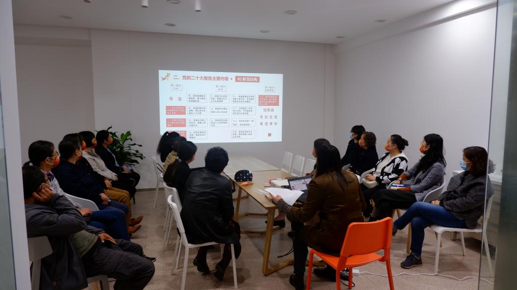 会上行政实验党支部书记李慧晓杉以《深入学习贯彻党的二十大精神 以中国式现代化全面推进中华民族伟大复兴》为题,带领支部党员学习党的二十大精神。她从介绍党的二十大召开基本情况引入,围绕深刻领会把握党的二十大主题、精神内涵和主要成果,深刻领会把握过去五年和新时代十年的伟大变革及其里程碑意义,深入学习领会以中国式现代化全面推进中华民族伟大复兴的使命任务等内容,介绍了党的二十大报告的重要内容和精神。带领大家重点学习了报告第五部分关于教育、科技、人才工作的主要论述。党的二十大报告思想深刻、内涵丰富,鼓舞人心、催人奋进。通过本次学习,大家纷纷表示,作为一名党员,将继续不断加强个人自学,切实把党的二十大精神内化于心、外化于行,以实际行动推动二十大精神在自己的岗位落地生根,形成生动实践,为学校、学院高质量发展贡献自己的力量!
