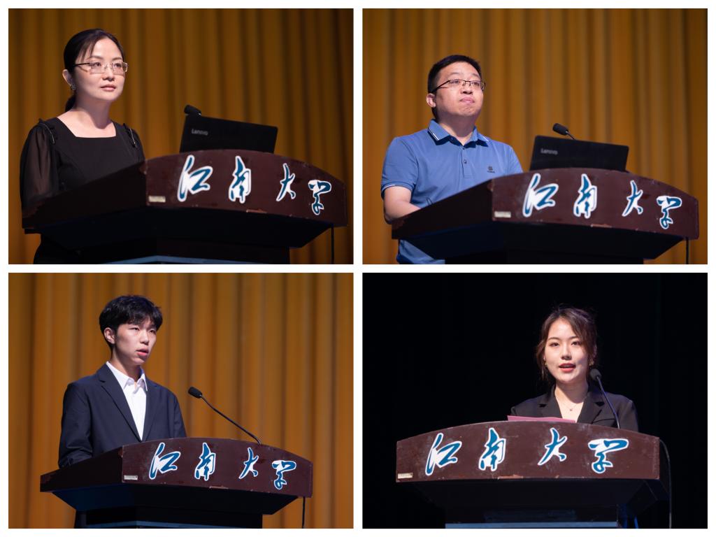 纺织工程系教师代表傅佳佳和轻化工程系教师代表殷允杰分别寄语新生。傅佳佳希望新生们守住一份健康、学会做人做事、好好珍惜时光,在江南收获属于自己的美丽人生。殷允杰作为老师,作为学长希望同学们严于律己、抵住诱惑、不畏艰难、珍惜时光,为大学交上一份满意的答卷!