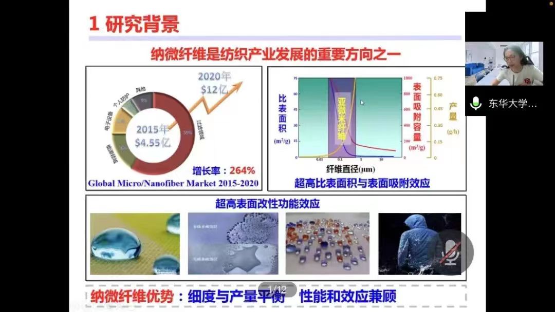 围绕纳微纤维的优势,覃教授分别从纳微纤维装备的研究、纳微纤维精细过滤非织造布的研究和纳微纤维新型过滤结构的研究三个方面,结合丰富的图表详细介绍团队在纳微科技领域取得的成果,突出纳微纤维在纺织行业发展中的方向性意义。