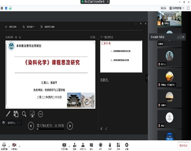 2022年4月27日下午,纺织学院通过线上线下结合的形式召开了院级课程思政中期检查暨工作推进会。全体院领导、系主任、教改项目负责人参加了会议。会议由副院长黄锋林主持。