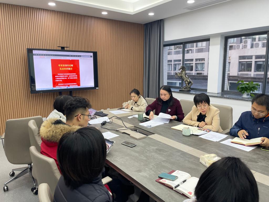 会议伊始,院党委书记张菁带领大家学习了习近平总书记在纪念辛亥革命110周年大会上的重要讲话。110年前,孙中山先生发出了振兴中华的呐喊,誓要建设一个焕然一新的中国。如今,在中国共产党的领导下,祖国的强盛早已超出孙中山先生当年的宏愿。辛亥革命110年来的历史,给予了我们深刻的启示。