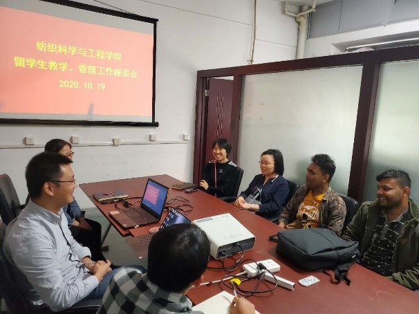 10月19日,纺织科学与工程学院的留学生教学、管理工作座谈会在纺织学院举行。纺织学院副院长黄锋林、刘庆生,纺织工程系系主任傅佳佳,留学生班主任柯莹、徐荷澜、崔鹏,以及在校留学生代表卡萨那和萨拉查参加了座谈会