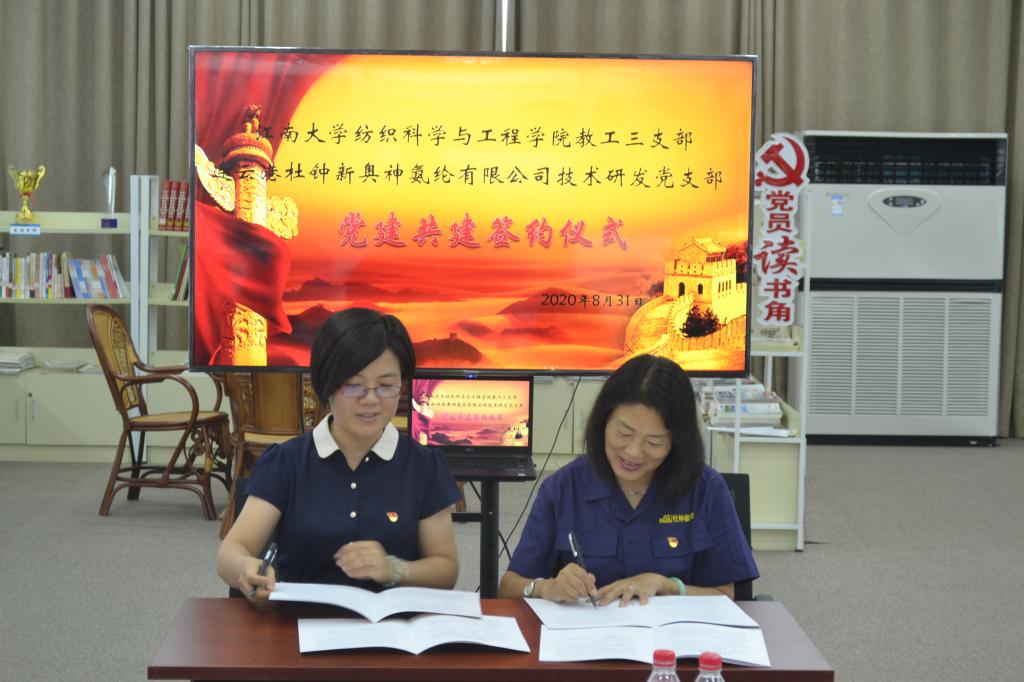 31日上午,针织支部全体党员在连云港杜钟新奥神氨纶有限公司技术研发支部的带领下,首先参观了奥神氨纶公司党建活动室、廉政文化教育展厅和廉政文化主题公园。随后由针织支部书记万爱兰和技术研发支部书记王雪洁分别讲授党课,并签订了结对共建协议。本次支部共建本着“资源共享、优势互补、注重实效”的原则,努力通过校企共建的平台,促进双方通过产学研紧密合作、技术创新、产品研发、市场推广等方式,共享工作资源、交流工作经验、解决实际问题,实现党的建设与企业发展良性互动,共同为行业科技进步做出各自贡献,实现共创、共建、共享、共赢。
