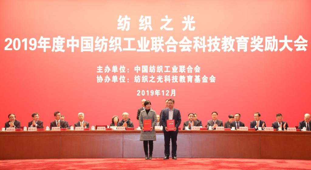 2019年12月6日,由中国纺织工业联合会主办,纺织之光科技教育基金会协办的“纺织之光”2019年度中国纺织工业联合会科技教育奖励大会在北京人民大会堂隆重召开。大会对为我国纺织科技、教育、产业发展作出突出贡献的学界、行业精英进行了表彰,颁发了2019年度中国纺织工业联合会科学技术发明奖、科学技术进步奖、特别贡献奖(桑麻学者)、教育教学成果奖、“纺织之光”教师奖和学生特别奖等奖项,我校师生荣获大会十多项荣誉。