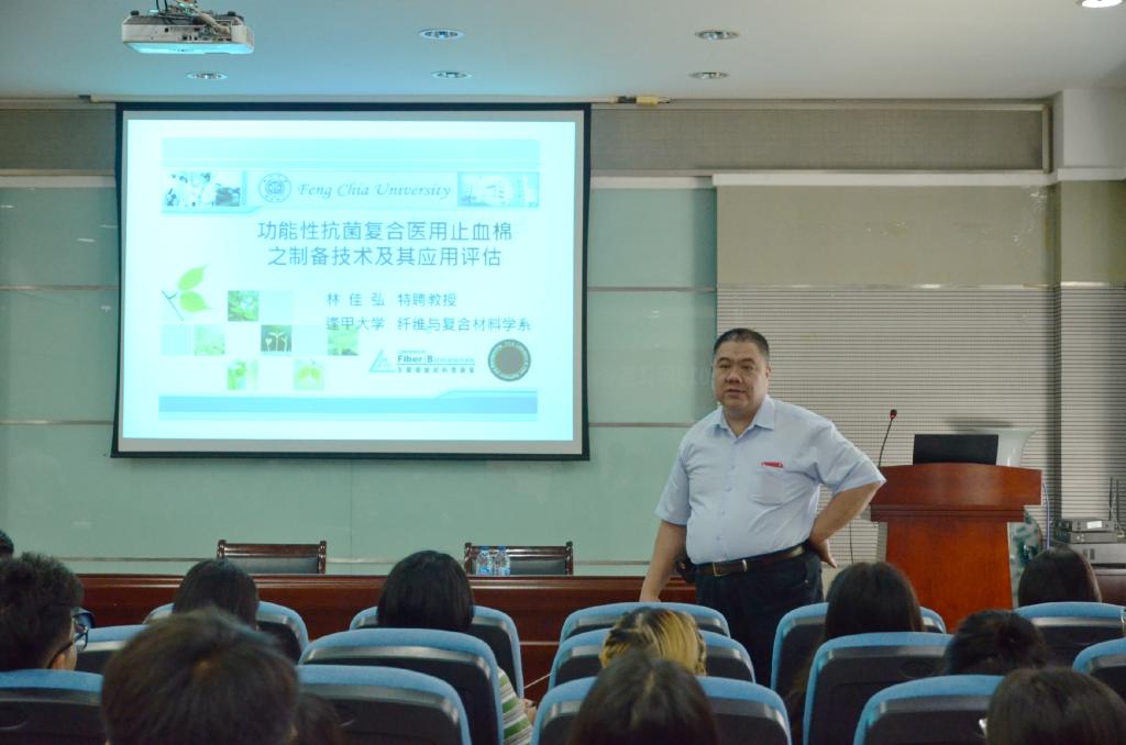 江南大学纺织服装学院副院长潘如如教授主持开场。首先由逢甲大学纤维与复合材料学系林佳弘教授带来学术报告,他对功能性抗菌复合医用止血棉之制备技术及其应用评估进行了阐述,包含纺织概念、分类到纺织结构复合材料、纺织复合材料的定义等介绍,用问答的方式更好地调动了大家的积极性,还介绍了目前的工作业绩和主要研究成果。