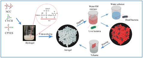 图1.气凝胶制备及油水分离/抗菌流程图