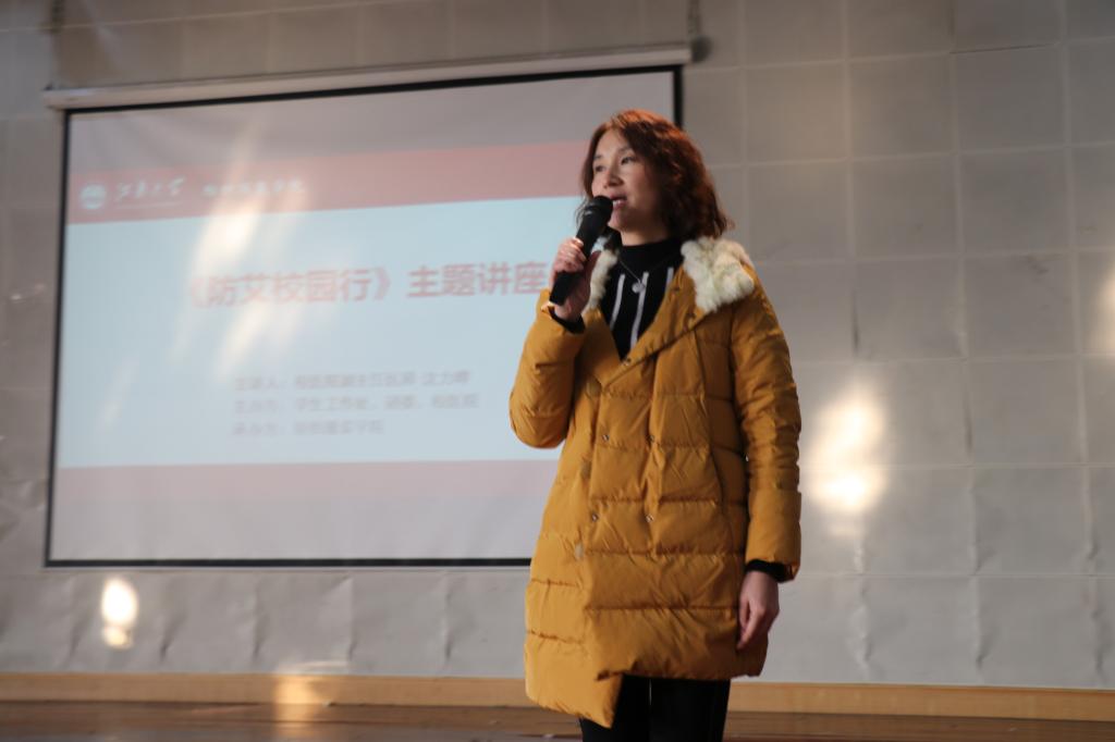 12月12日下午,由学生工作处、校团委和校医院联合举办的《防艾校园行》健康教育讲座纺织服装学院分场,在纺服学院C区表演厅举办。江南大学校医院副主任医师沈力晔医生应邀作专题讲座,来自设计学院、机械学院、环土学院、理学院、法学院以及纺服学院的300余名学生聆听了讲座。