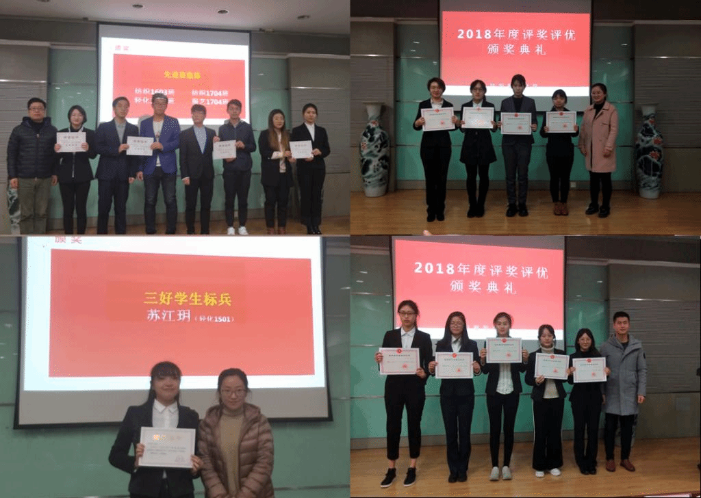 随后,进行2018年度评奖评优颁奖典礼,学院奖助工作分管辅导员陈裕老师宣读2018年度国家奖学金、优秀学业辅导员、三好学生标兵以及先进班集体获奖名单,并对2018年学院奖助政策进行解读,学院领导和老师为获奖学生颁奖。国家奖学金、三好学生标兵获得者苏江玥代表获奖学生发言,与同学们分享自己大学学习生活经历和体会,鼓励大家能够充分利用大学学习时光,在学习中奋进,不断提升自身能力。纺织1603班团支书储瑶作为先进班集体代表进行风采展示,从自身学习心得、宿舍学习风气培养以及班级学风建设等方面交流学习经验,分享成长感悟,通过凝聚共识、严格纪律、结对帮带等方式不断提高班级学习意识、营造班级优良学风。此外,陈裕老师针对即将开始的期末考试,向与会的各班级学生代表,开展诚信考试主题教育,加强同学们对诚信考试的重视,进一步引导同学们端正考风考纪。