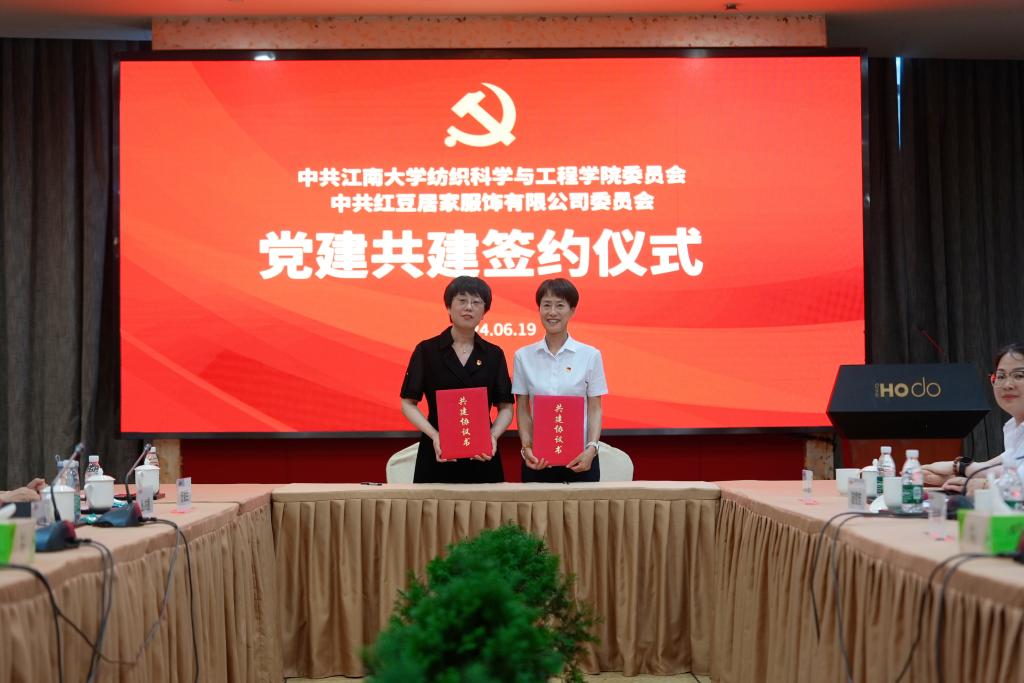 张菁燕、钱静分别代表学院党委、红豆居家党委签订党建共建协议书。今后,双方将在组织建设互促、党员干部互动、党建载体互用、双向赋能互助等方面展开深入合作。与会人员围绕基层党组织建设、企业文化建设、纺织精神传承、产学研工作等进行了交流讨论。