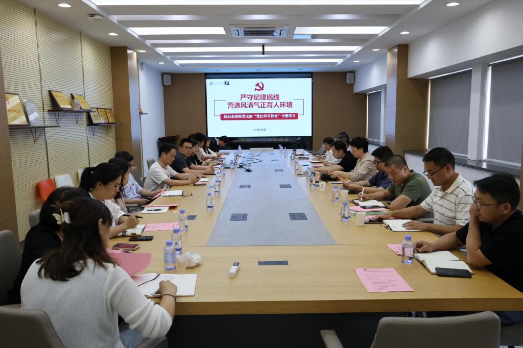6月6日下午,纺织科学与工程学院纺织系教师党支部在学院A306会议室召开“党纪学习教育”专题学习。校党委委员、党委办公室主任、保密工作办公室主任王维到场巡听督学,校党委委员、学院党委书记张菁燕,及党支部20余名党员同志参加学习。专题学习会议由党支部书记俞科静教授主持。