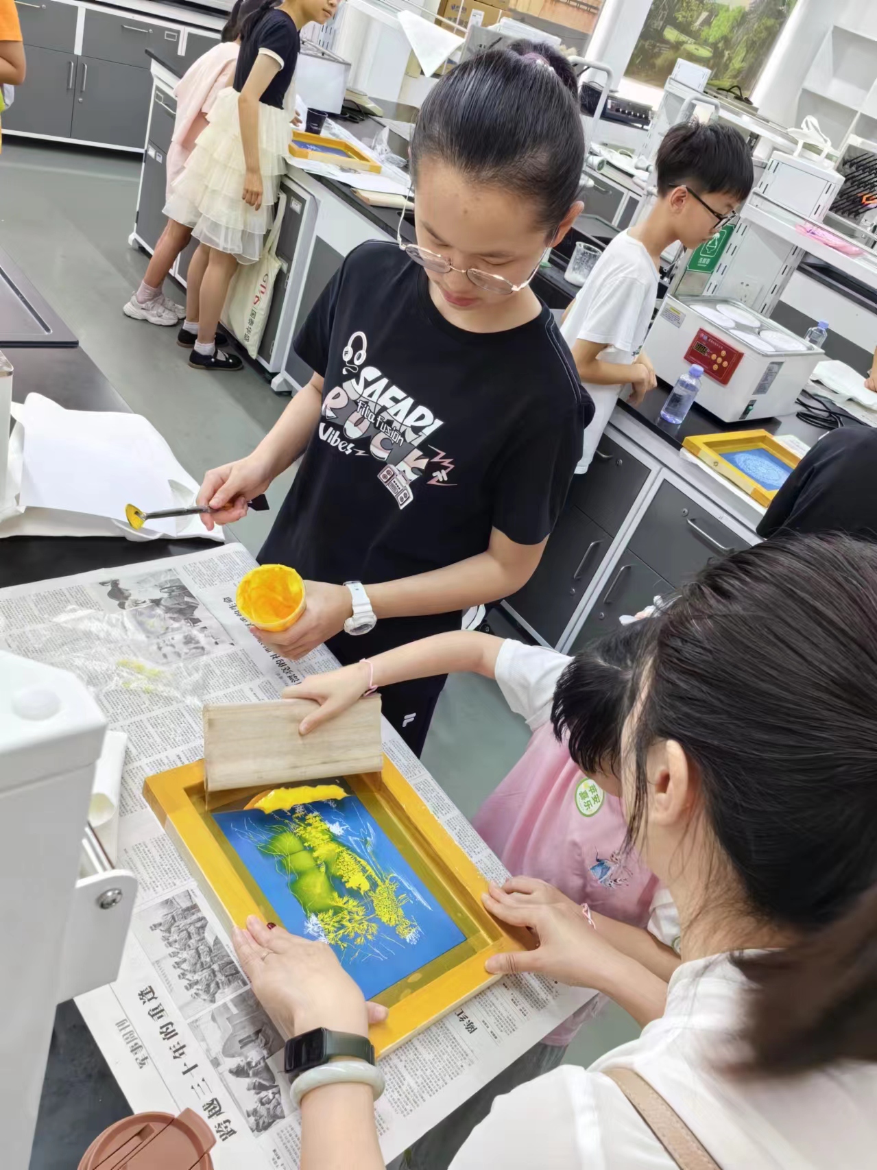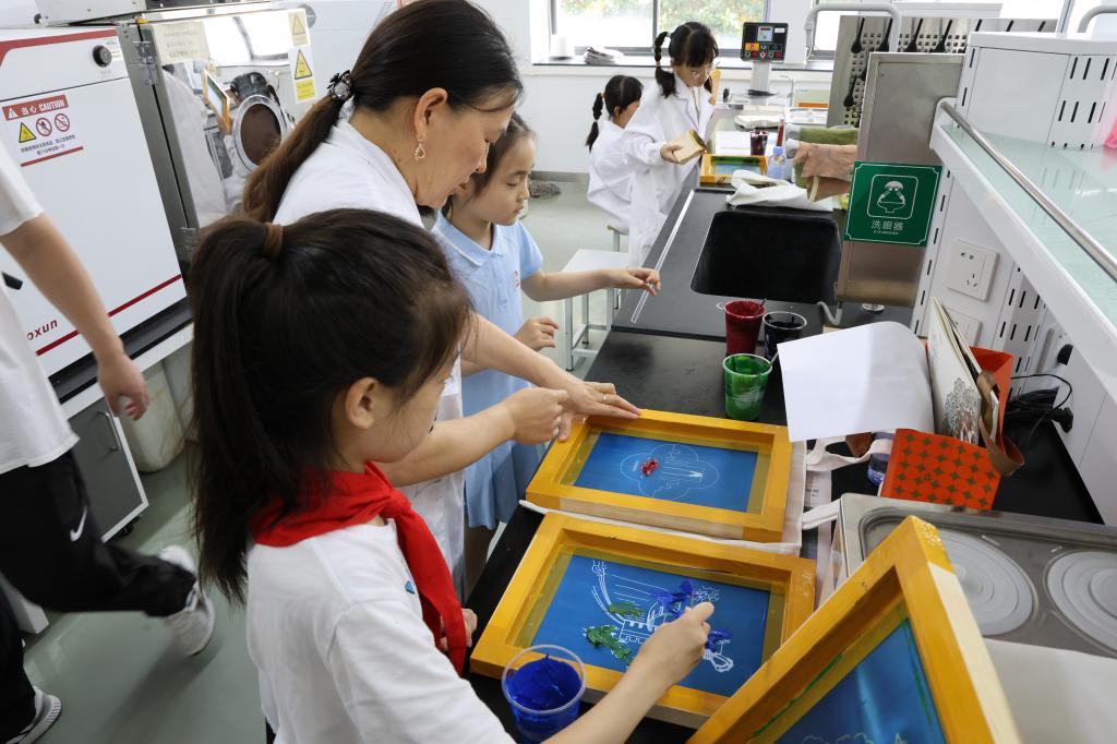 活动中,“江小娃”们首先兴致勃勃地参观了江南大学民间服饰传习馆。馆内陈列丰富的实物展示与详细讲解,让他们对我国传统服饰的历史、文化内涵及制作工艺有了更为深刻的认识。随后,在专业指导老师的悉心指导下,学生们亲自动手体验了丝网印刷这一传统工艺。这一实践环节,让他们不仅感受到了服饰染整技术的魅力,还加深了对纺织品知识的理解,收获了满满的成就感和喜悦。